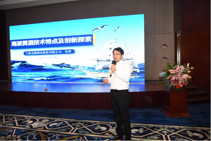 上海金枫酒业股份有限公司副总经理张辉就“海派黄酒技术特点及创新探索”主题发表演讲。张总对以上海金枫、石库门为代表的海派黄酒的技术特点以及近年来做的创新一一做了介绍。
