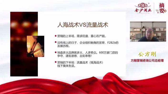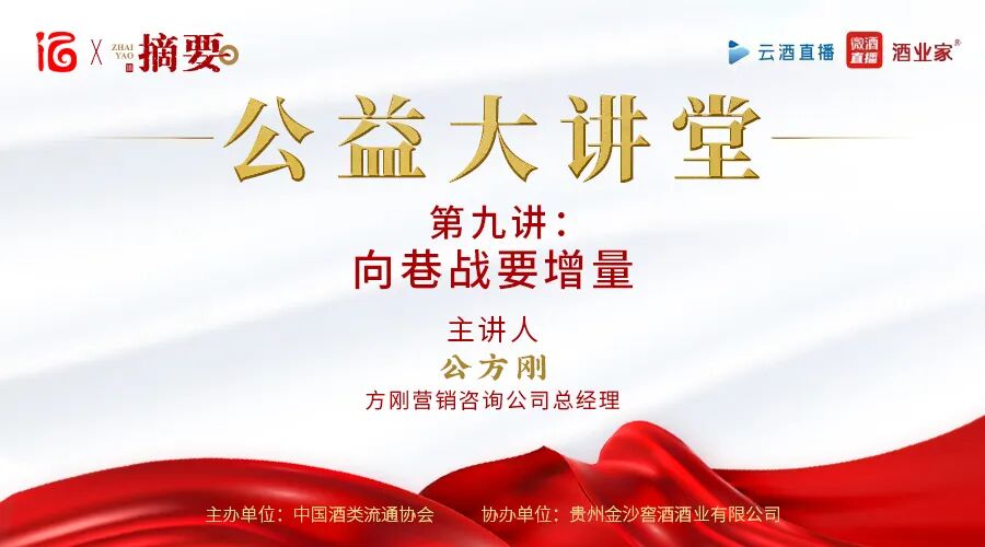 近日,由中国酒类流通协会主办,贵州金沙窖酒酒业有限公司协办的“摘要·公益大讲堂”第九讲《向巷战要增量》,在云酒、酒业家、微酒三家直播平台开讲。
