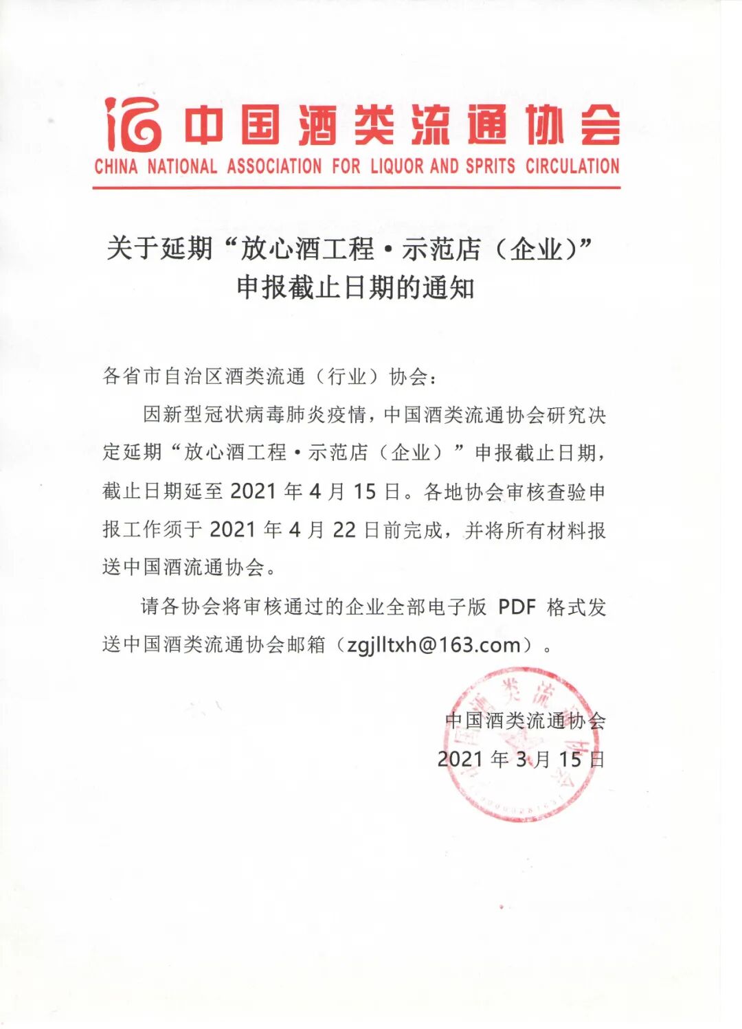 因新型冠状病毒肺炎疫情,中国酒类流通协会研究决定延期“放心酒工程·示范店(企业)”申报截止日期,截止日期延至2021年4月15日。各地协会审核查验申报工作须于2021年4月22日前完成,并将所有材料报送中国酒流通协会。