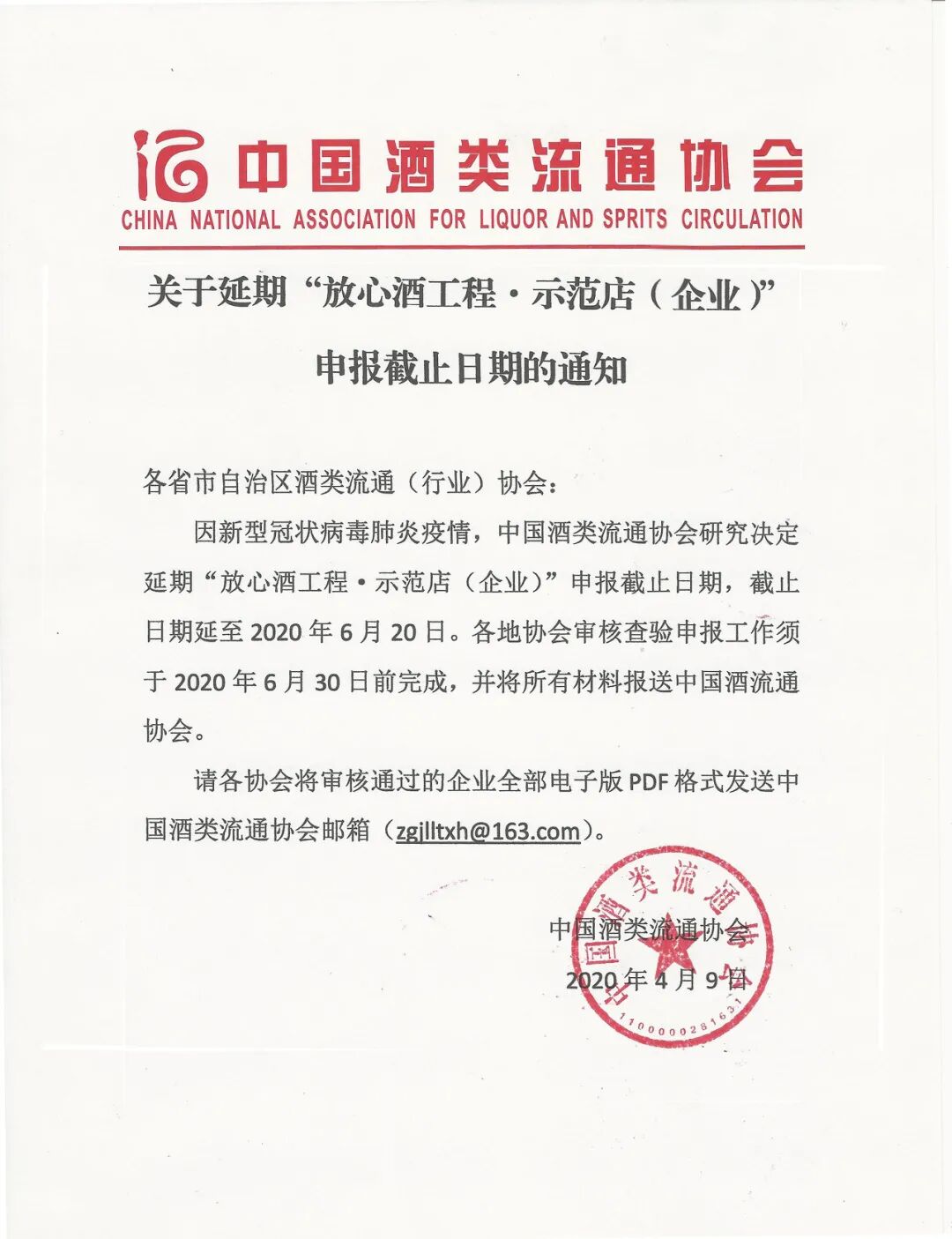 因新型冠状病毒肺炎疫情,中国酒类流通协会研究决定延期“放心酒工程·示范店(企业)”申报截止日期,截止日期延至2020年6月20日。各地协会审核查验申报工作须于2020年6月30日前完成,并将所有材料报送中国酒流通协会。