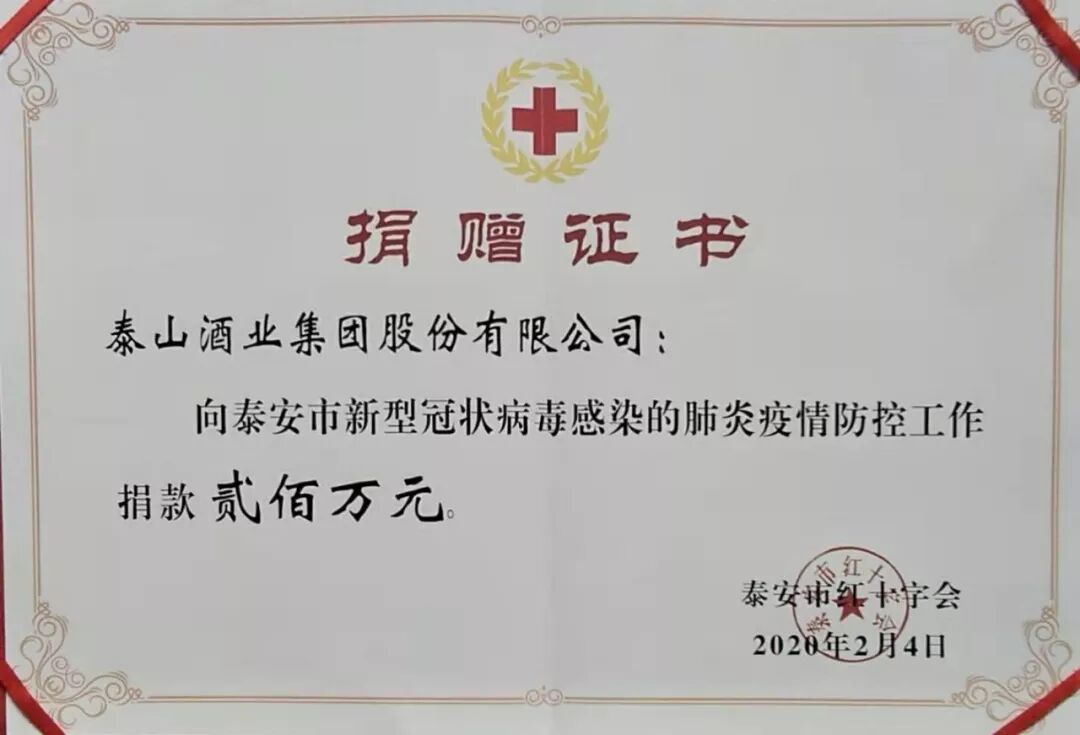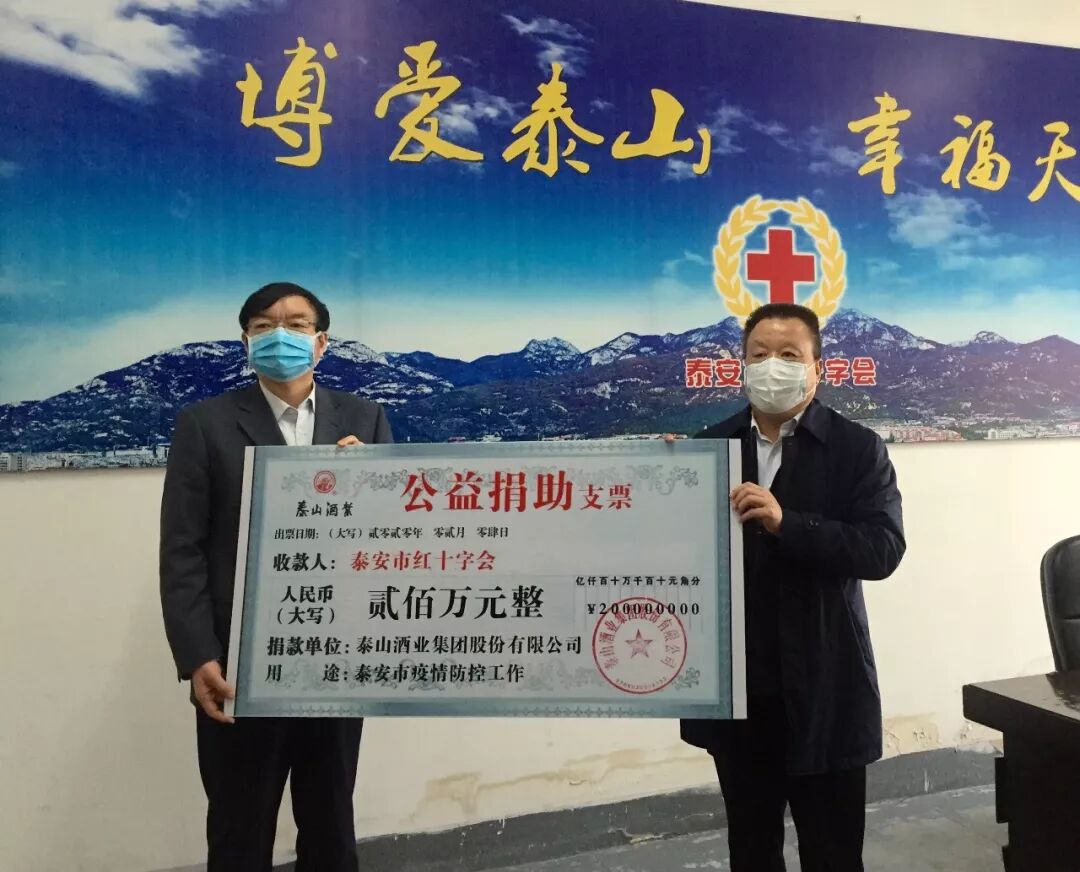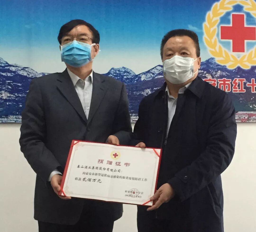 作为鲁酒领军企业,泰山酒业集团也同样做出表率,踊跃捐款。2月4日,泰山酒业集团董事长、总经理张铭新代表泰山酒业集团向泰安市红十字会捐赠200万元,泰安市人民政府副市长袁久党出席捐赠活动,并对泰山酒业的善举和责任担当给予充分肯定。泰山安,则天下安。据悉,这笔善款将用于泰安当地疫情防控工作。