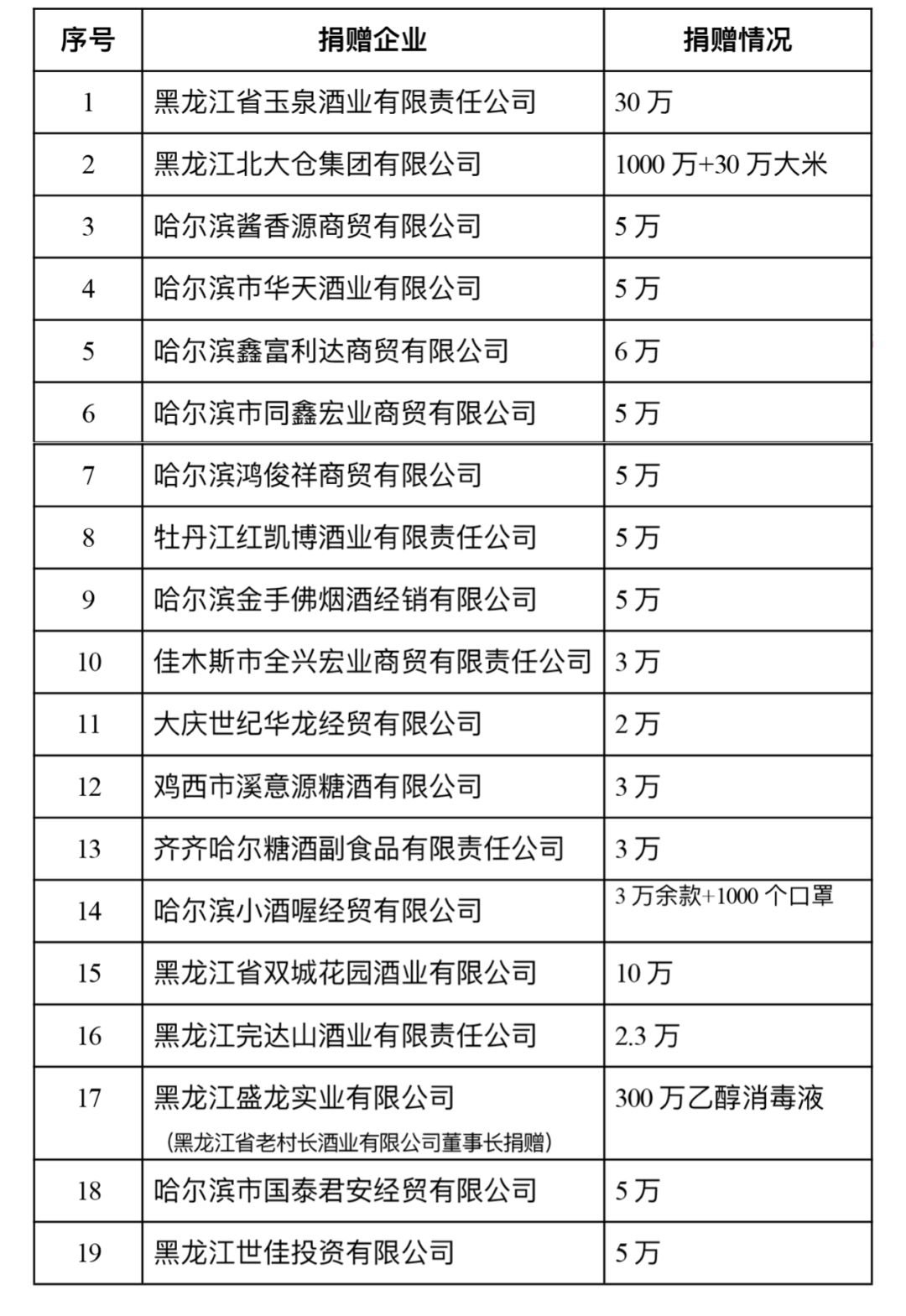 截⽌今⽇,⿊⻰江省酒类流通协会部分会员企业捐赠情况如下: