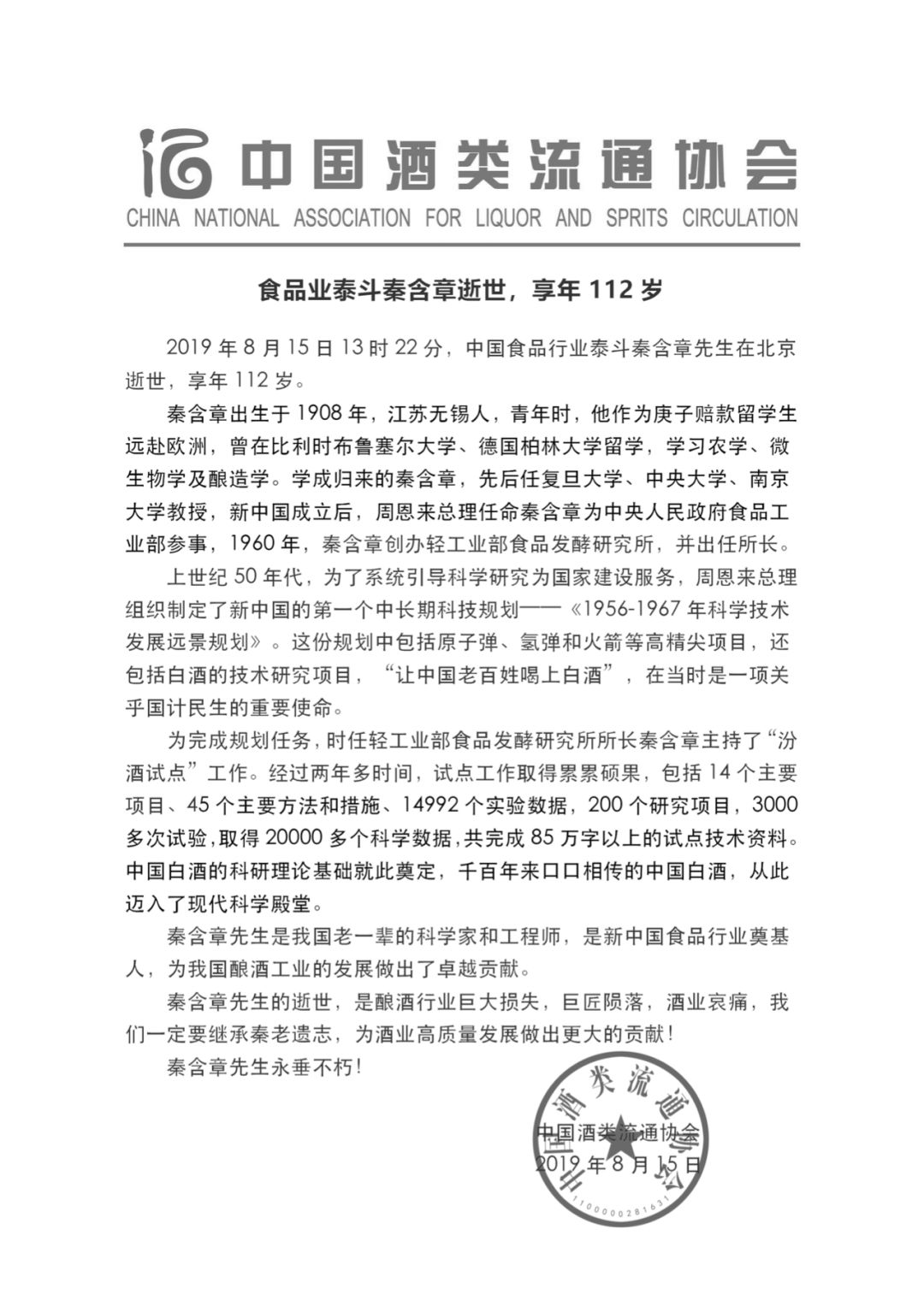 2019年8月15日13时22分,中国食品行业泰斗秦含章先生在北京逝世,享年112岁。