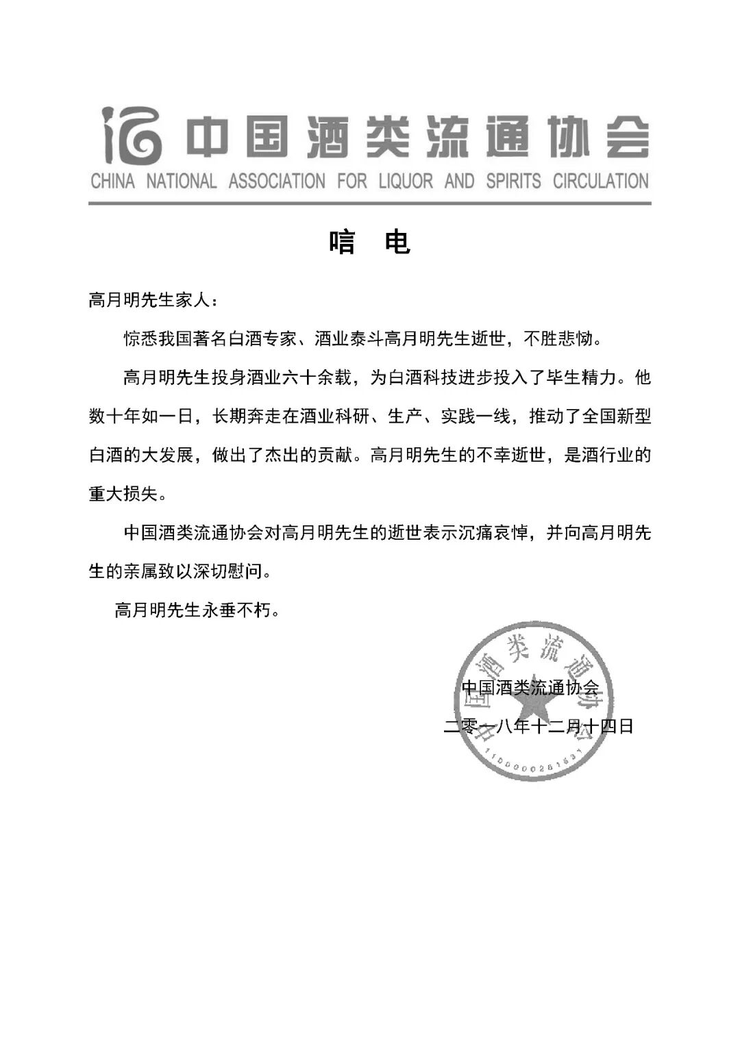 中国酒类流通协会对高月明先生的逝世表示沉痛哀悼,并向高月明先生的亲属致以深切慰问。