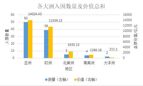 二、从入选品牌数量看,亚洲第一、欧洲第二、北美洲第三