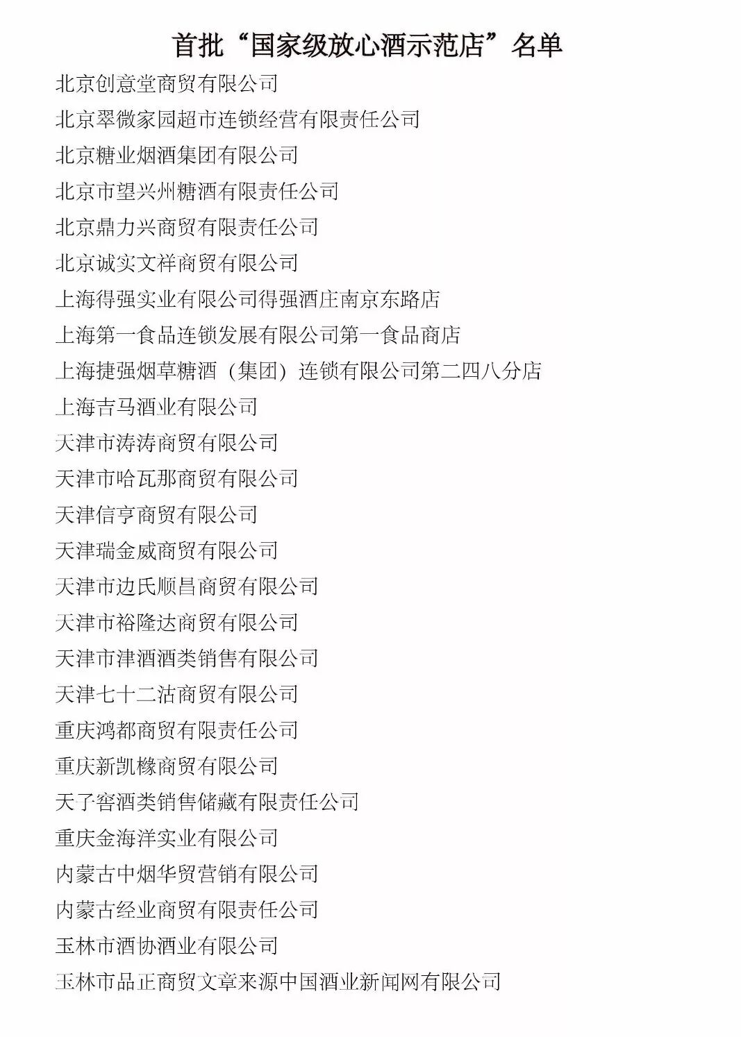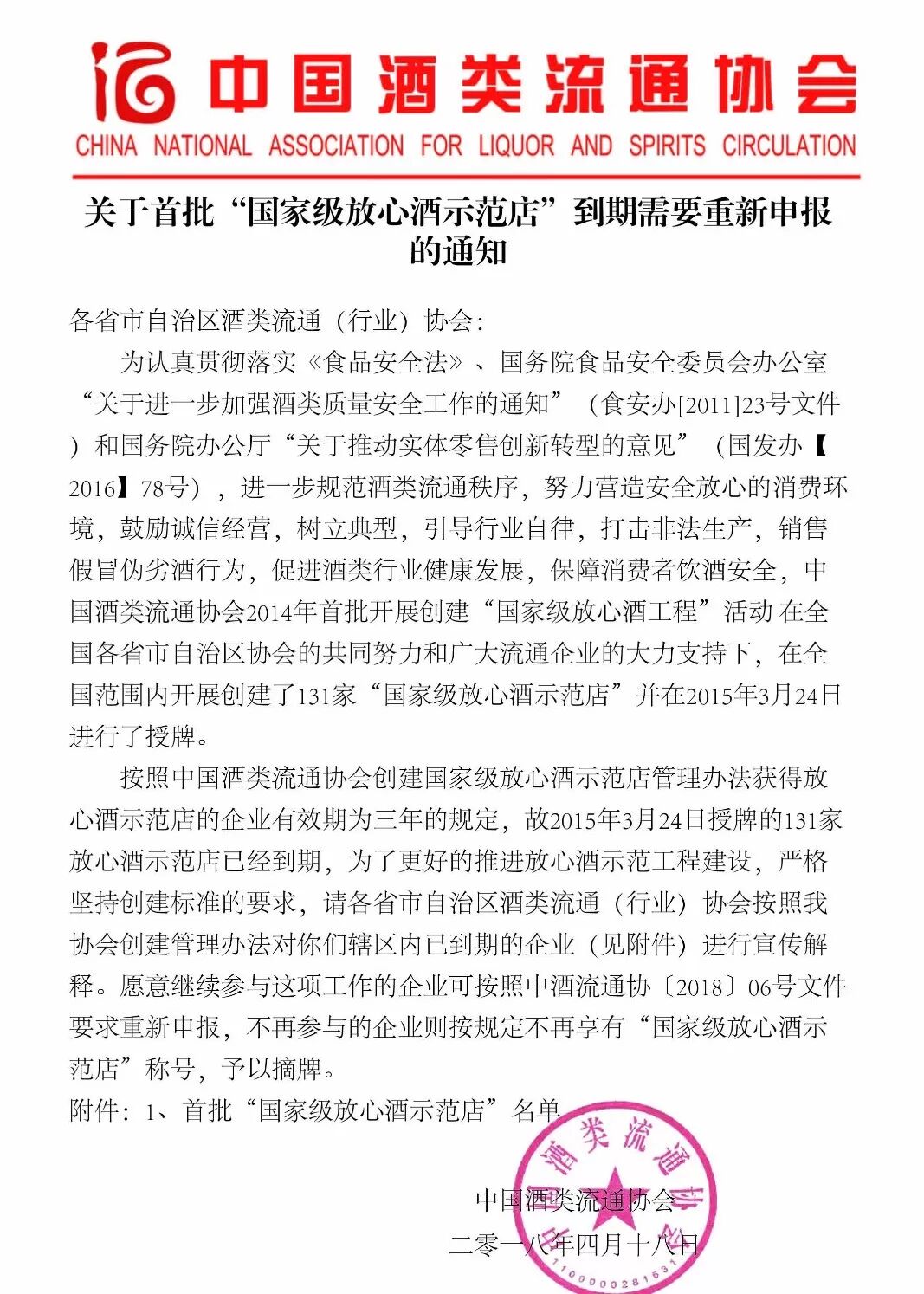 按照中国酒类流通协会创建国家级放心酒示范店管理办法获得放心酒示范店的企业有效期为三年的规定,故2015年3月24日授牌的131家放心酒示范店已经到期,为了更好的推进放心酒示范工程建设,严格坚持创建标准的要求,请各省市自治区酒类流通(行业)协会按照我协会创建管理办法对你们辖区内已到期的企业(见附件)进行宣传解释。愿意继续参与这项工作的企业可按照中酒流通协〔2018〕06号文件要求重新申报,不再参与的企业则按规定不再享有“国家级放心酒示范店”称号,予以摘牌。