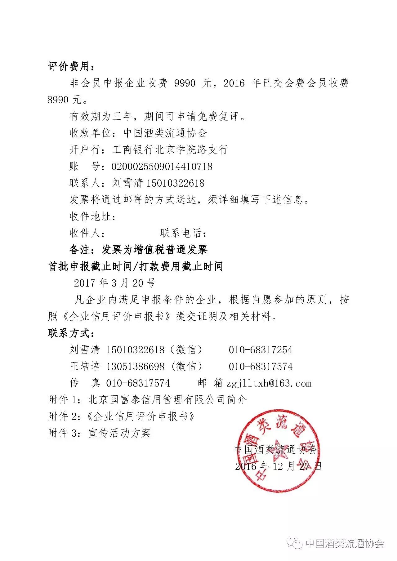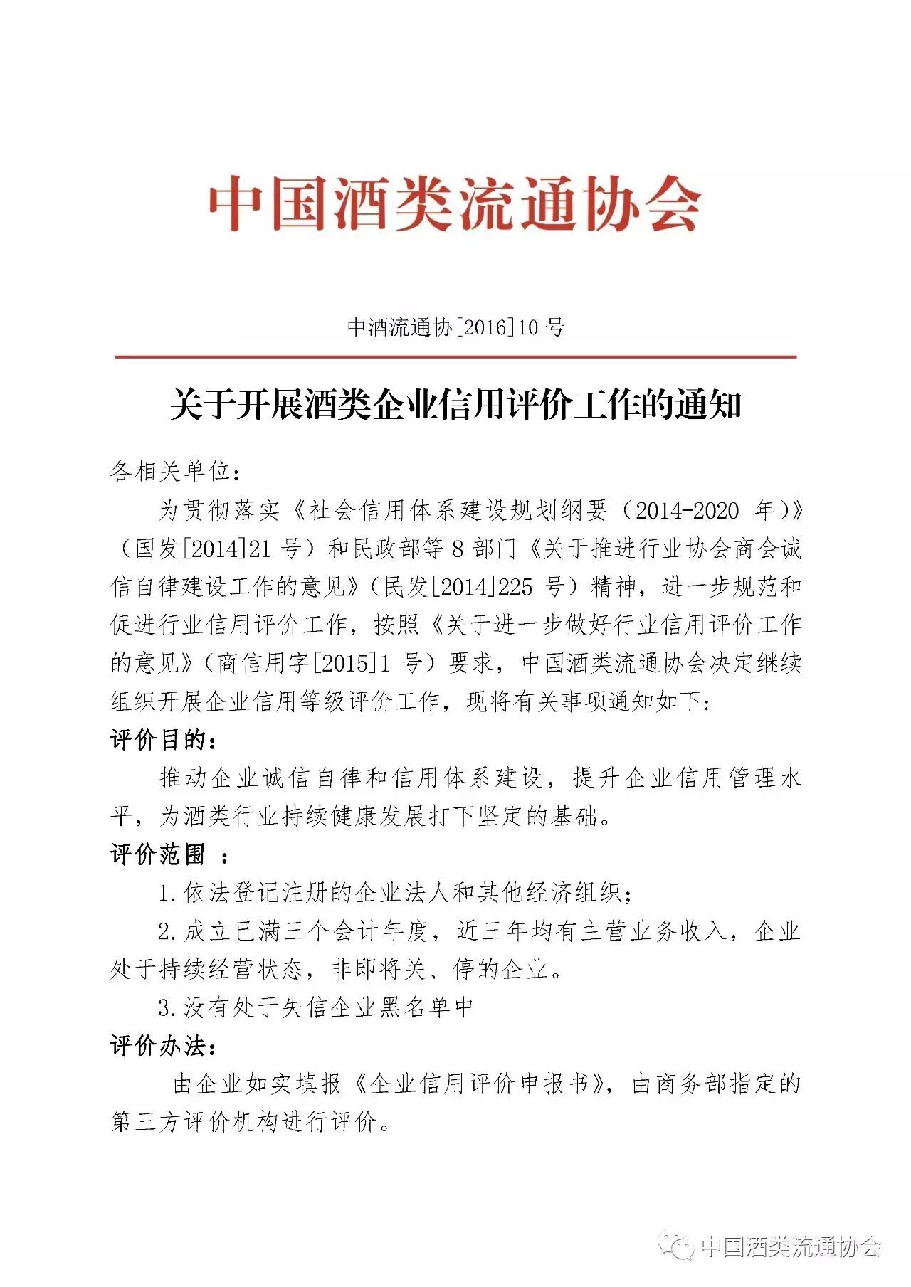 为贯彻落实《社会信用体系建设规划纲要(2014-2020年)》(国发[2014]21号)和民政部等8部门《关于推进行业协会商会诚信自律建设工作的意见》(民发[2014]225号)精神,进一步规范和促进行业信用评价工作,按照《关于进一步做好行业信用评价工作的意见》(商信用字[2015]1号)要求,中国酒类流通协会决定继续组织开展企业信用等级评价工作,现将有关事项通知如下: