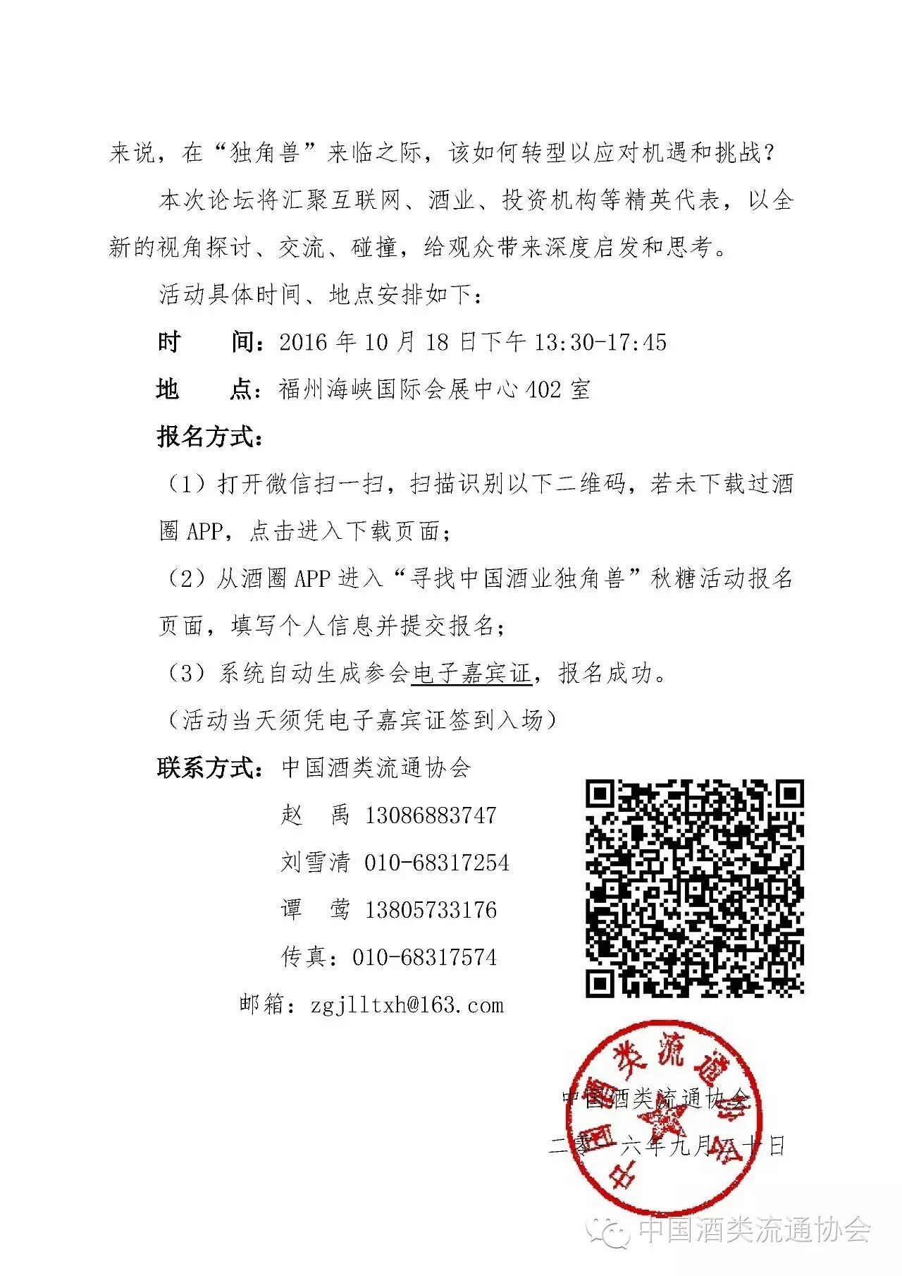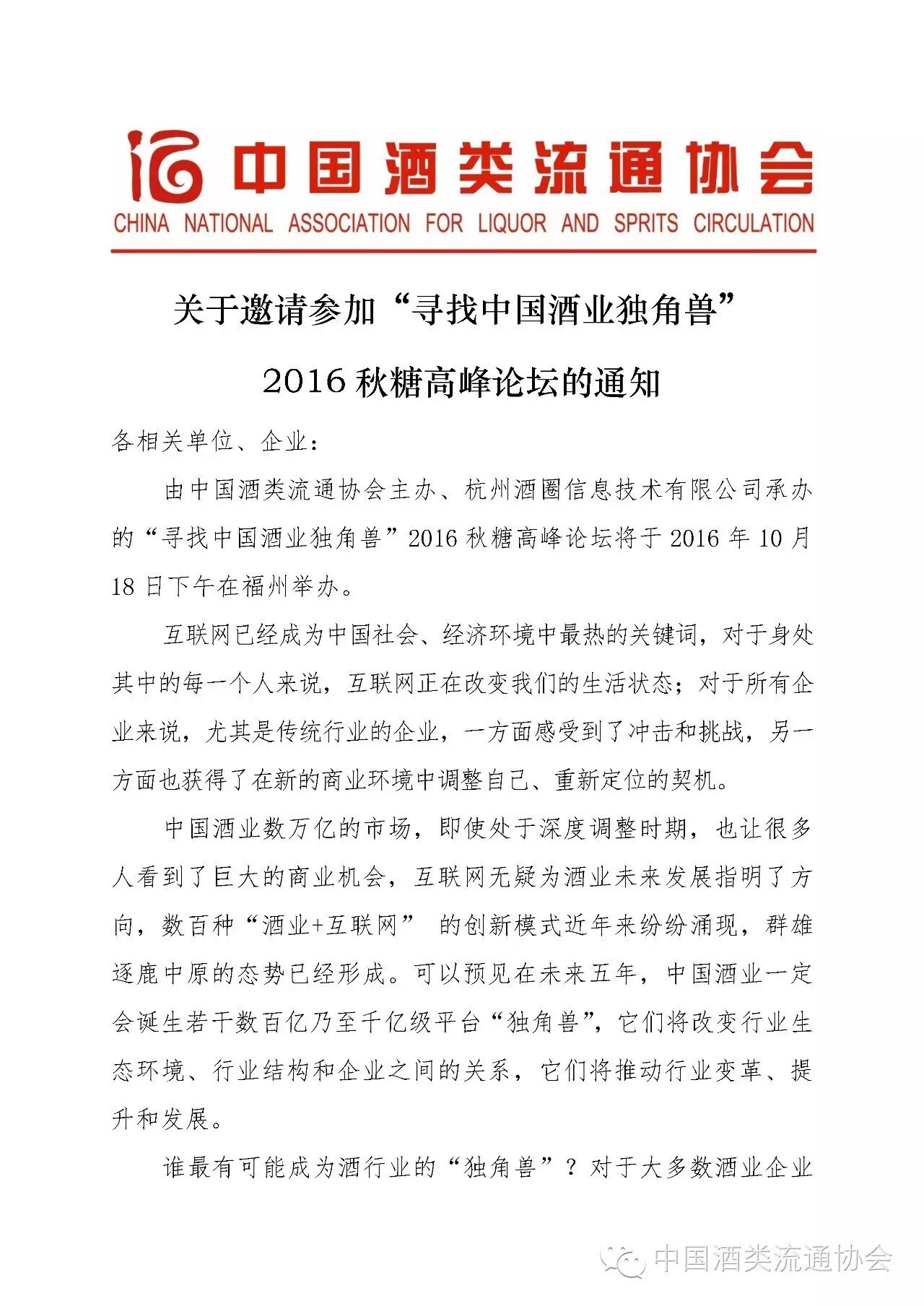 由中国酒类流通协会主办、杭州酒圈信息技术有限公司承办的“寻找中国酒业独角兽”2016秋糖高峰论坛将于2016年10月18日下午在福州举办。
