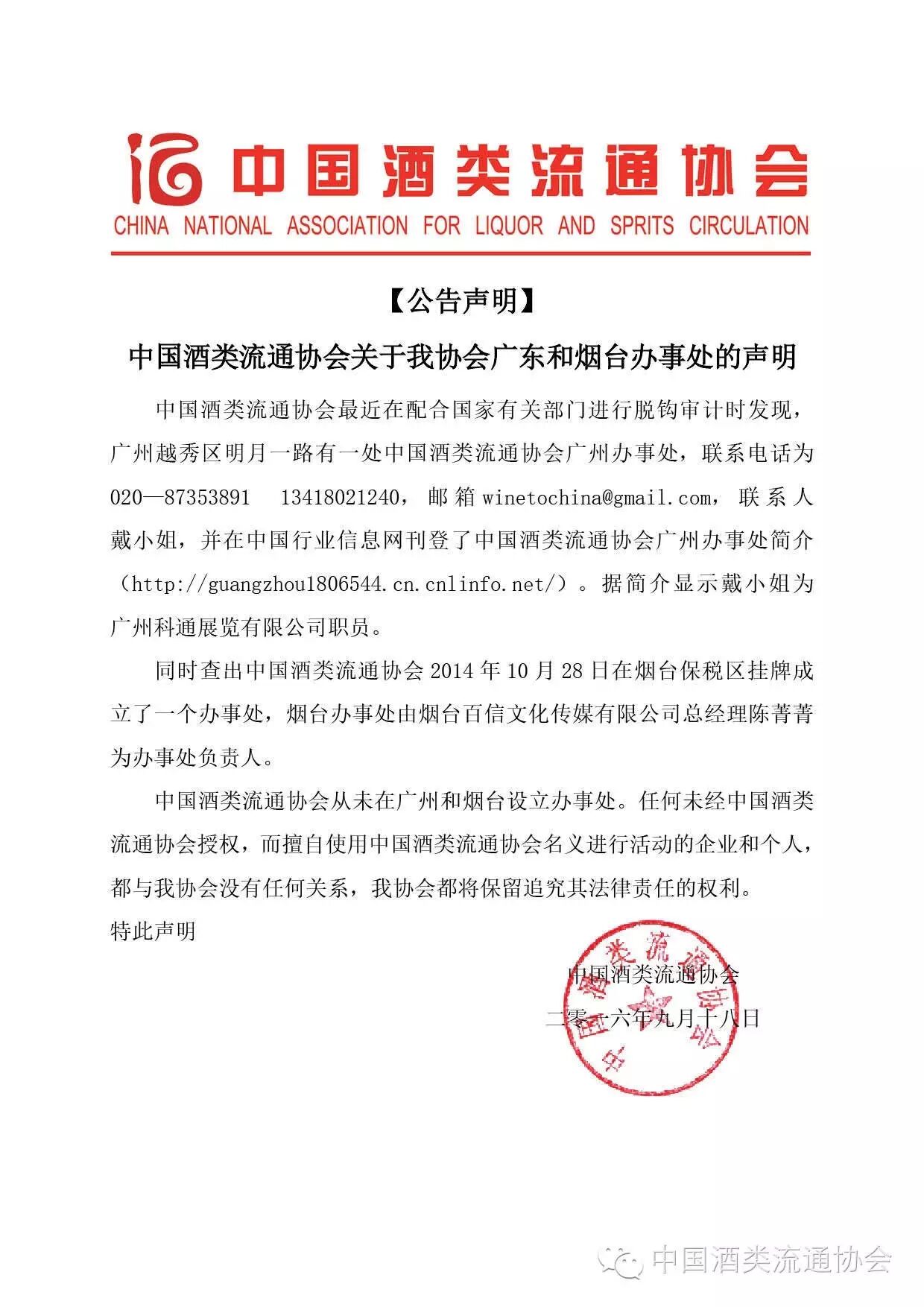 中国酒类流通协会从未在广州和烟台设立办事处。任何未经中国酒类流通协会授权,而擅自使用中国酒类流通协会名义进行活动的企业和个人,都与我协会没有任何关系,我协会都将保留追究其法律责任的权利。