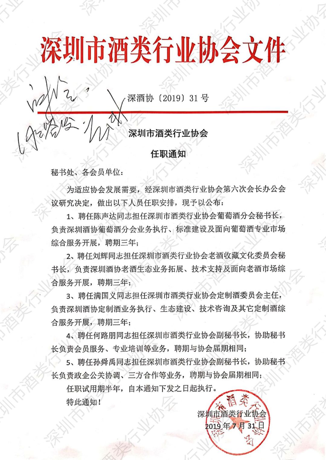 2、聘任刘辉同志担任深圳市酒类行业协会老酒收藏文化委员会秘书长,负责深圳酒协老酒生态业务拓展、技术支持及面向老酒市场综合服务开展,聘期三年;
