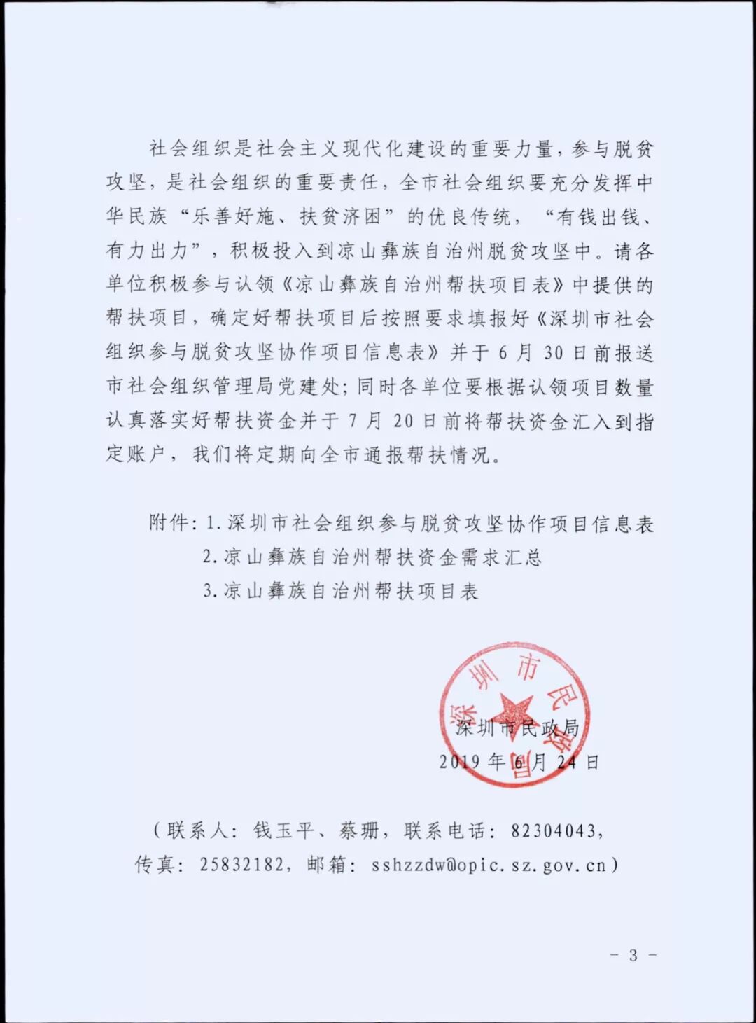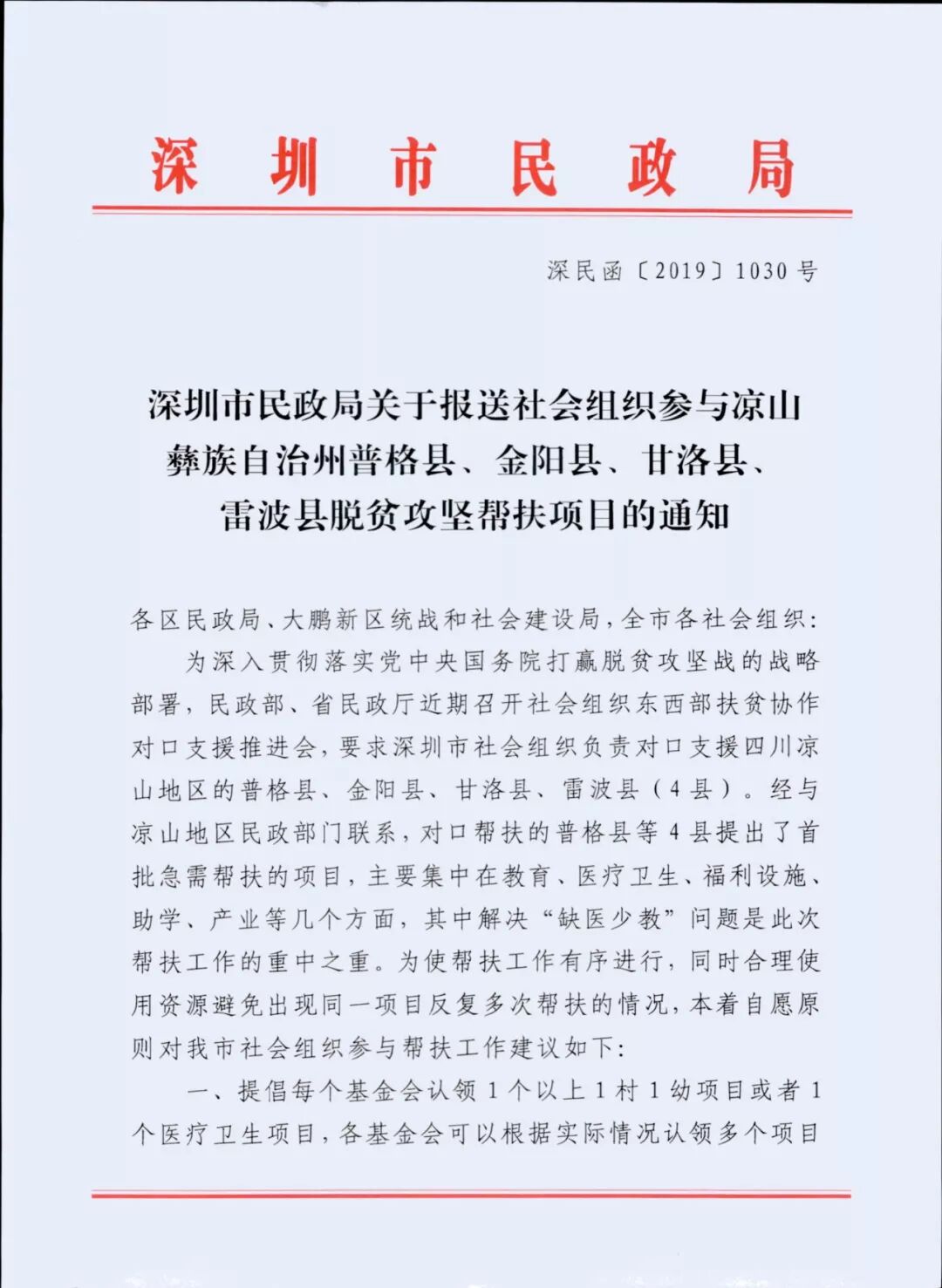 为深入贯彻落实党中央国务院打赢脱贫攻坚战的战略部署,民政部、省民政厅要求深圳市社会组织负责对口支援四川凉山地区普格、金阳、甘洛、雷波等四县。经我会上级部门与凉山地区民政部门联系,确认首批急需对口帮扶项目主要集中在教育、医疗卫生、助学、产业等方面。