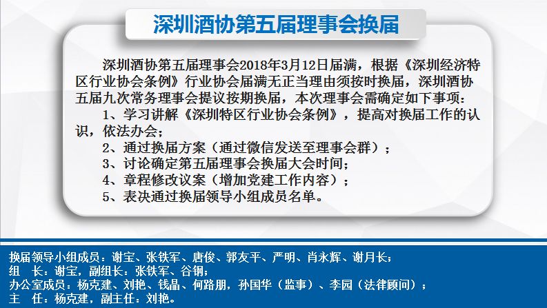 第五届理事会将于2018年3月12日届满到期,根据深圳市酒类行业协会章程规定,定于2018年3月至4月期间召开换届大会。
