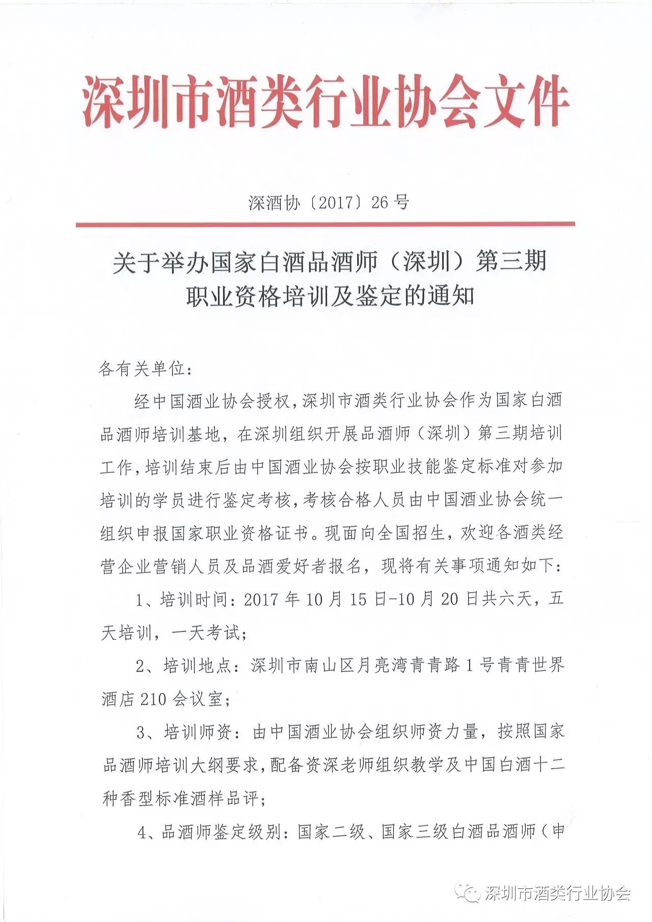 经中国酒业协会授权,深圳市酒类行业协会作为国家白酒品酒师培训基地,在深圳组织开展品酒师(深圳)第三期培训工作,培训结束后由中国酒业协会按职业技能鉴定标准对参加培训的学员进行鉴定考核,考核合格人员由中国酒业协会统一组织申报国家职业资格证书。现面向全国招生,欢迎各酒类经营企业营销人员及品酒爱好者报名,现将有关事项通知如下: