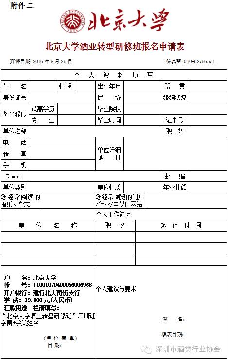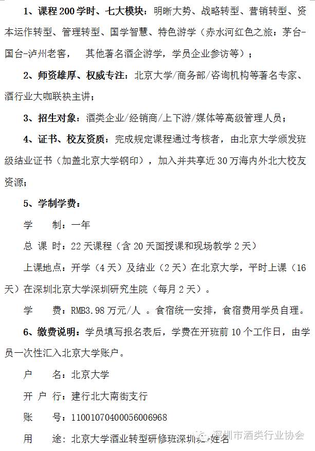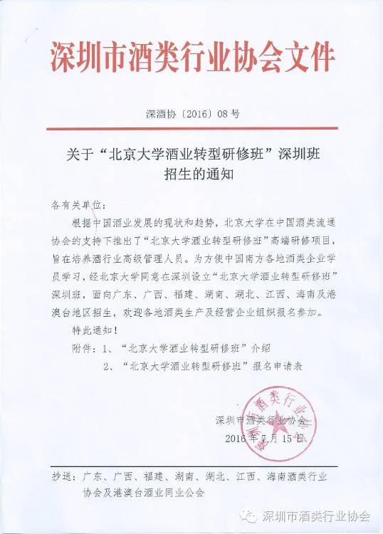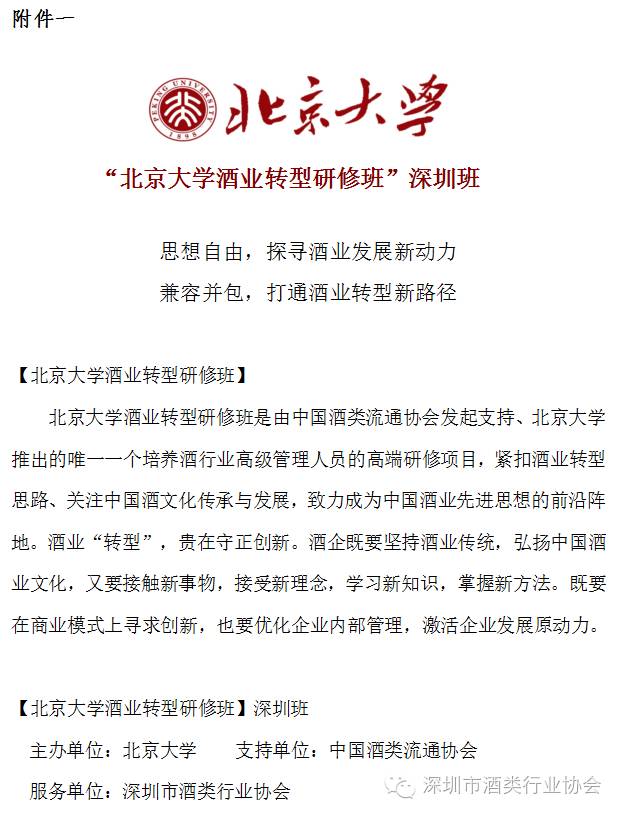 根据中国酒业发展的现状和趋势,北京大学在中国酒类流通协会的支持下推出了“北京大学酒业转型研修班”高端研修项目,旨在培养酒行业高级管理人员。为方便中国南方各地酒类企业学员学习,经北京大学同意在深圳设立“北京大学酒业转型研修班”深圳班,面向广东、广西、福建、湖南、湖北、江西、海南及港澳台地区招生,欢迎各地酒类生产及经营企业组织报名参加。