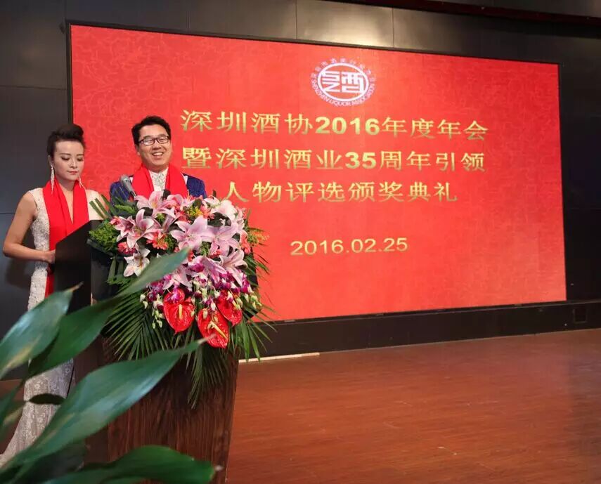 会员大会结束后,深圳酒协“2016年度年会暨深圳酒业35周年引领人物评选颁奖典礼”晚会盛大举行,广东省酒协秘书长彭洪,深圳酒协会长谢宝、常务副会长、副会长、理事及200余家会员,深圳酒业35周年引领人物,各商协会及企业家代表出席了晚宴。
