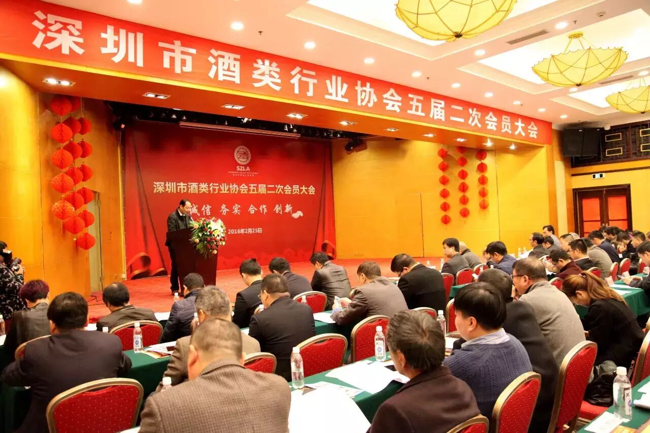 2016年2月25日,深圳市酒类行业协会第五届二次会员大会在深圳市银湖度假村银湖会堂隆重召开,深圳市食药局食品流通监管处副处长陈国进,深圳酒协会长谢宝、常务副会长、副会长、理事及200余家会员,深圳酒业35周年人气酒行及最喜爱的酒类品牌代表出席了会议。