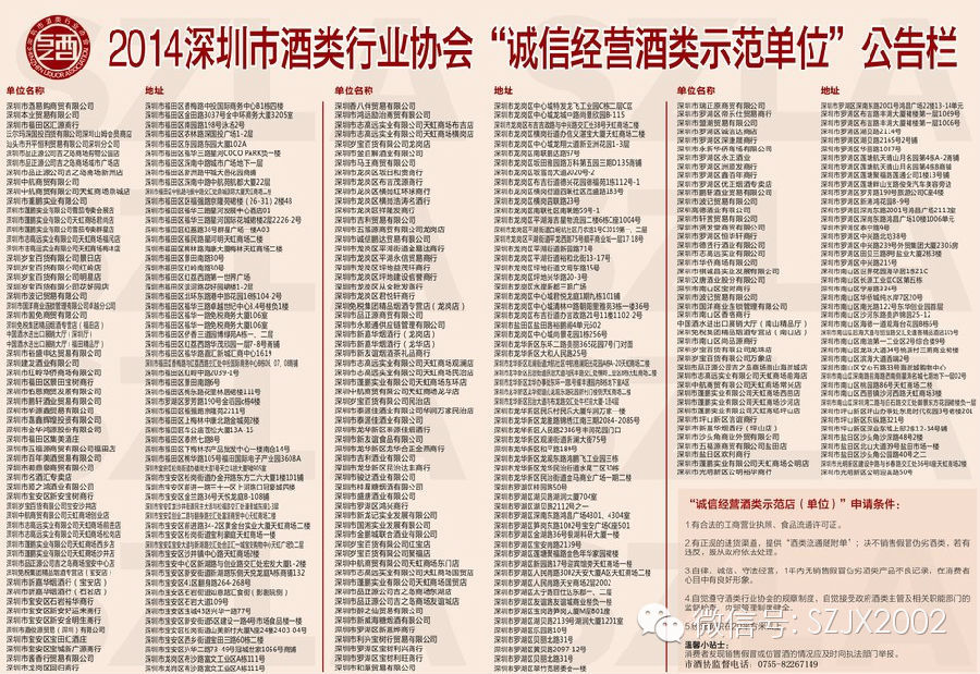 自2012年,市酒协发起“诚信经营酒类示范店(单位)”创建活动以来,受到社会广泛关注。岁宝百货、天虹商场、免税集团精品店、中国酒水等众多商超、名烟酒连锁店纷纷主动加入“酒业诚信体系”。 截至目前,已授牌的网点基本覆盖全市。