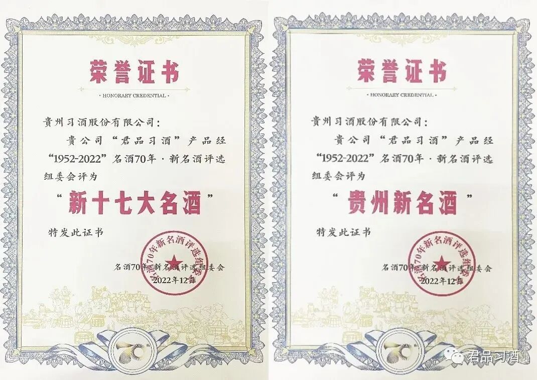 近日,由名酒观察、中国名酒大会、中国酒业研究院、酒业青年领袖俱乐部、探酒等平台机构发起,“名酒70年·新名酒评选组委会”主办的“1952-2022名酒70年·新名酒评选”活动评选结果出炉,君品习酒荣膺中国“新十七大名酒”“贵州新名酒”两项殊荣。