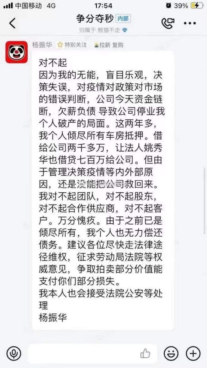 据熊猫不走内部员工透露,熊猫不走公司钉钉群解散前,创始人杨振华曾在群里发过一封道歉信。
