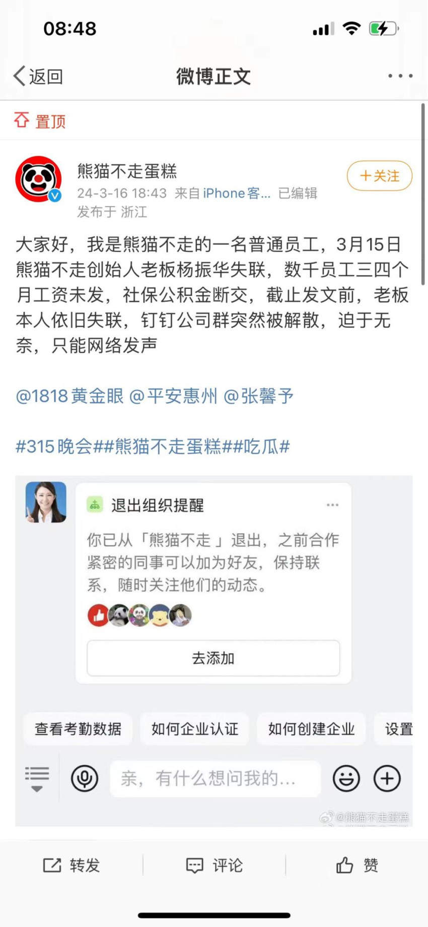 昨天(3月16日),熊猫不走的一名员工通过熊猫不走蛋糕官方微博向社会“求助”,其表示,自3月15日起熊猫不走创始人杨振华失联,数千员工三四个月工资未发,社保公积金断交,钉钉公司群突然被解散……