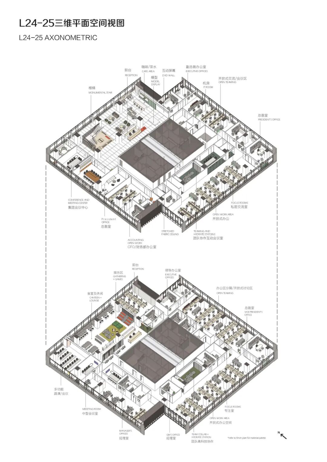 木条状的天花设计带来强烈又流畅的视觉体验,给予空间流动性。内外分区及有效分隔的设计将这里划分为不同社区,为不同的业务部门及个人提供高效及灵活的办公体验。办公,会议,互动,运动,娱乐,展示,专注,交流等功能将在这一层一一实现。