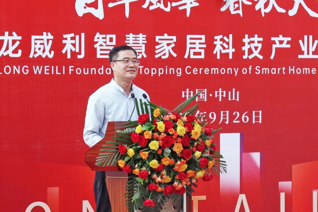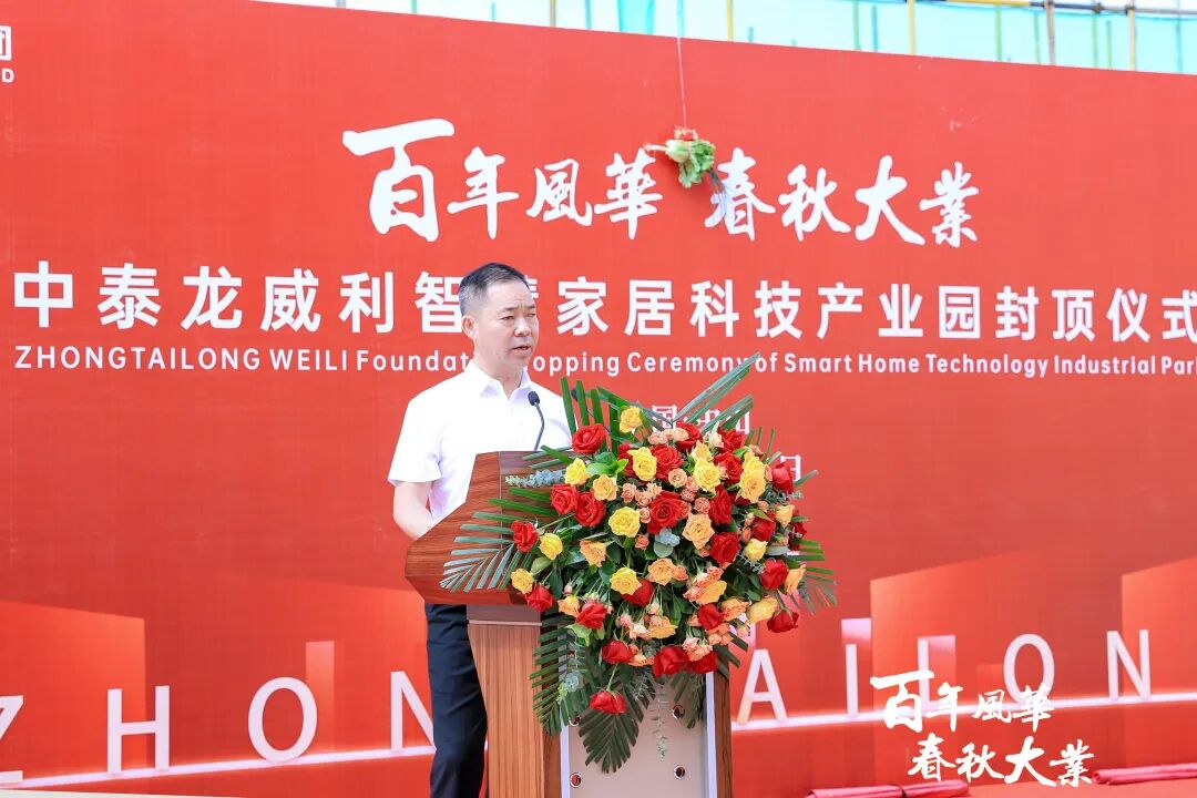 在封顶仪式上,陈秋桂董事长致欢迎词。他表示,中泰龙产业园不仅是中泰龙数字化、智能化转型的重要发展战略部署,也是打造家居产业与智能科技产业互补互促、协同发展新格局的重要契机。未来的中泰龙将以此为契机,积极统筹推进生产环境、办公环境、人居环境和生态环境建设,持之以恒地提升经营管理水平,加快推进集团总部经济发展,创造条件打造家具博物馆,积极营造工业生态旅游园区,朝着“企业强盛、员工幸福、担得起社会责任”的伟大梦想奋勇前行,为集团成立40周年大庆献礼,为中山树立起家具行业的标杆!