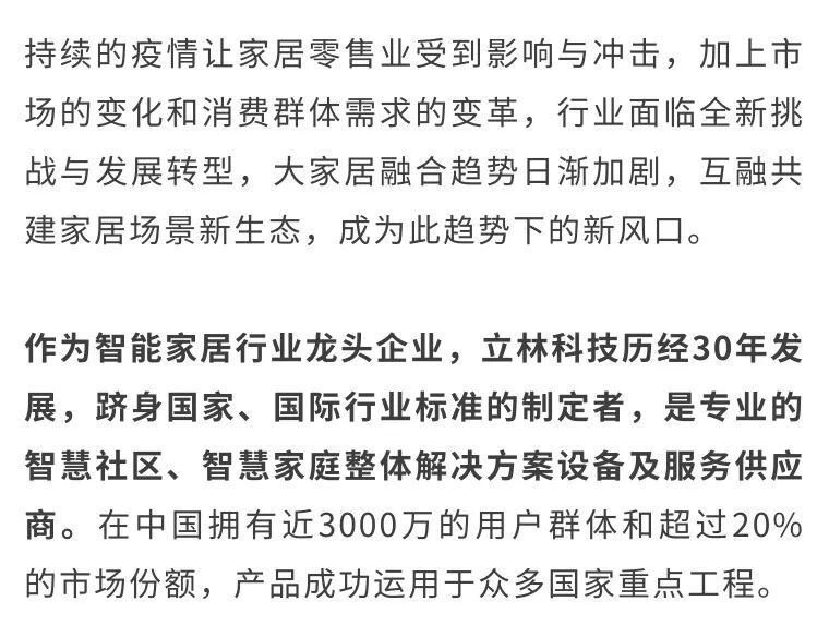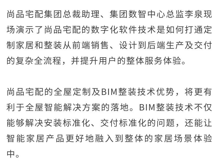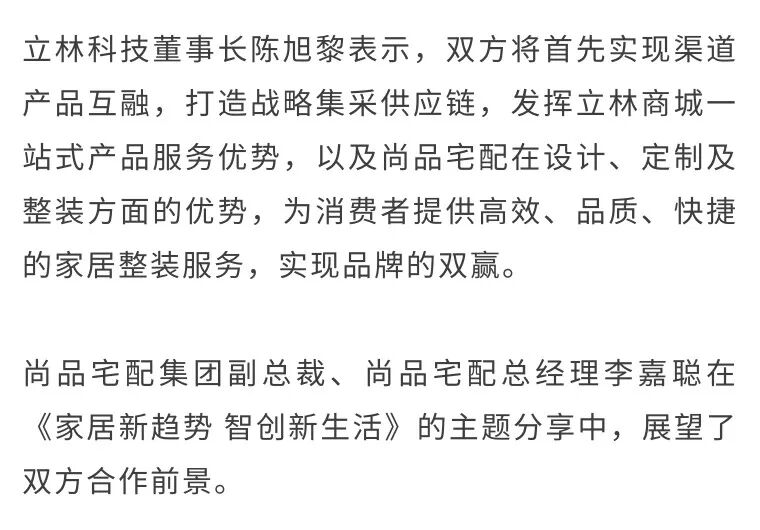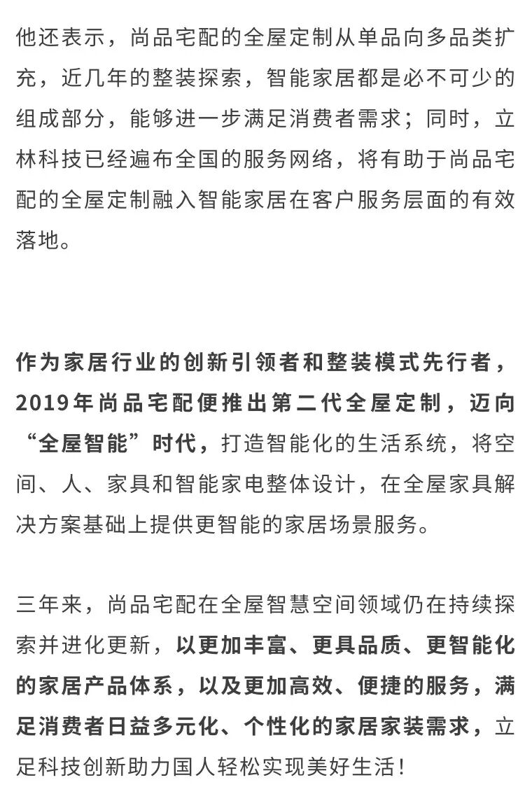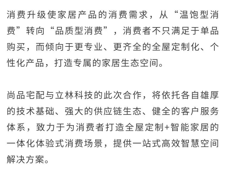 未来,双方将聚焦各自产品,以立林全链路服务整合+立林全品类智能产品+尚品宅配全屋定制+尚品全屋配套,共同打造“全屋生态场景”;尚品宅配将进入立林2000家门店扩张计划,融合落地“全屋生态场景”体验区;相互进驻战略供应链体系,实现前端营销同步;联合用户运营,实现客户资源共享。
