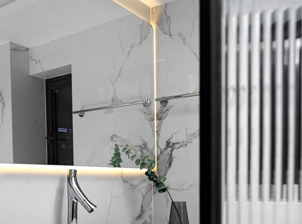 洗手间位置小,灯具大多数出现在天花板和墙面,这里需要注意的重点是,洗脸台避免使用时出现阴影,浴室避免窗户上映出人影,尽量选不容易留阴影的白色灯光,可选择带照明功能的镜柜和智能魔镜来辅助照明,使视野效果更佳。