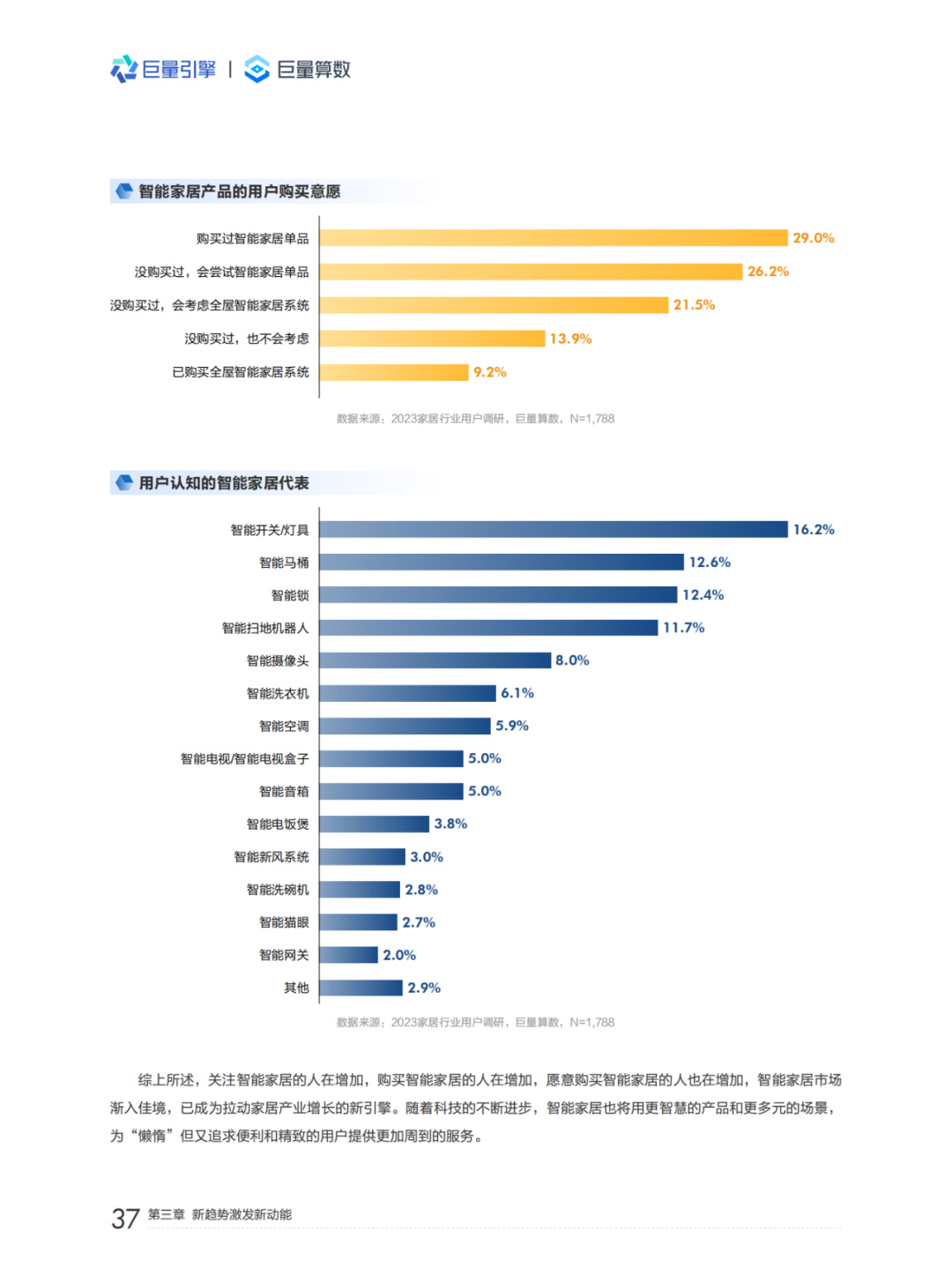 2023家居行业调研数据显示,对于目前流行的智能家居产品,有购买经历或购买意愿的用户占比高达86.1%。 今日免费下载:2023中国家居行业洞察报告