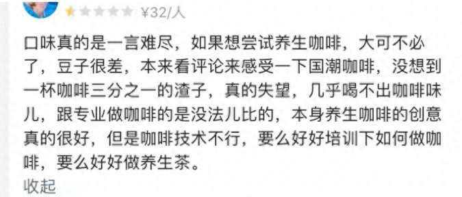以同仁堂出品的知嘛健康咖啡为例,不少消费者就在大众点评上评价道,“口味真的是一言难尽,如果想尝试养生咖啡,大可不必,豆子很差”“不好喝,一股中药味”……口味不好,自然复购率就低。