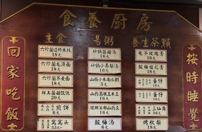 里面卖六珍菌过桥米线、茯苓煎饼、山药葛根玉米羹等各类有中药成分的养生主食、汤粥和茶点,涵盖一日三餐!