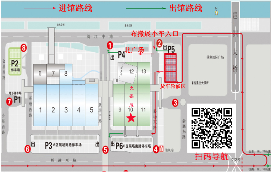 从地铁二号线(广州南站)上车,坐8站至(昌岗站)下车,转8号线坐8站至琶洲站,沿指示牌前往A出口,展馆在A出口附近。