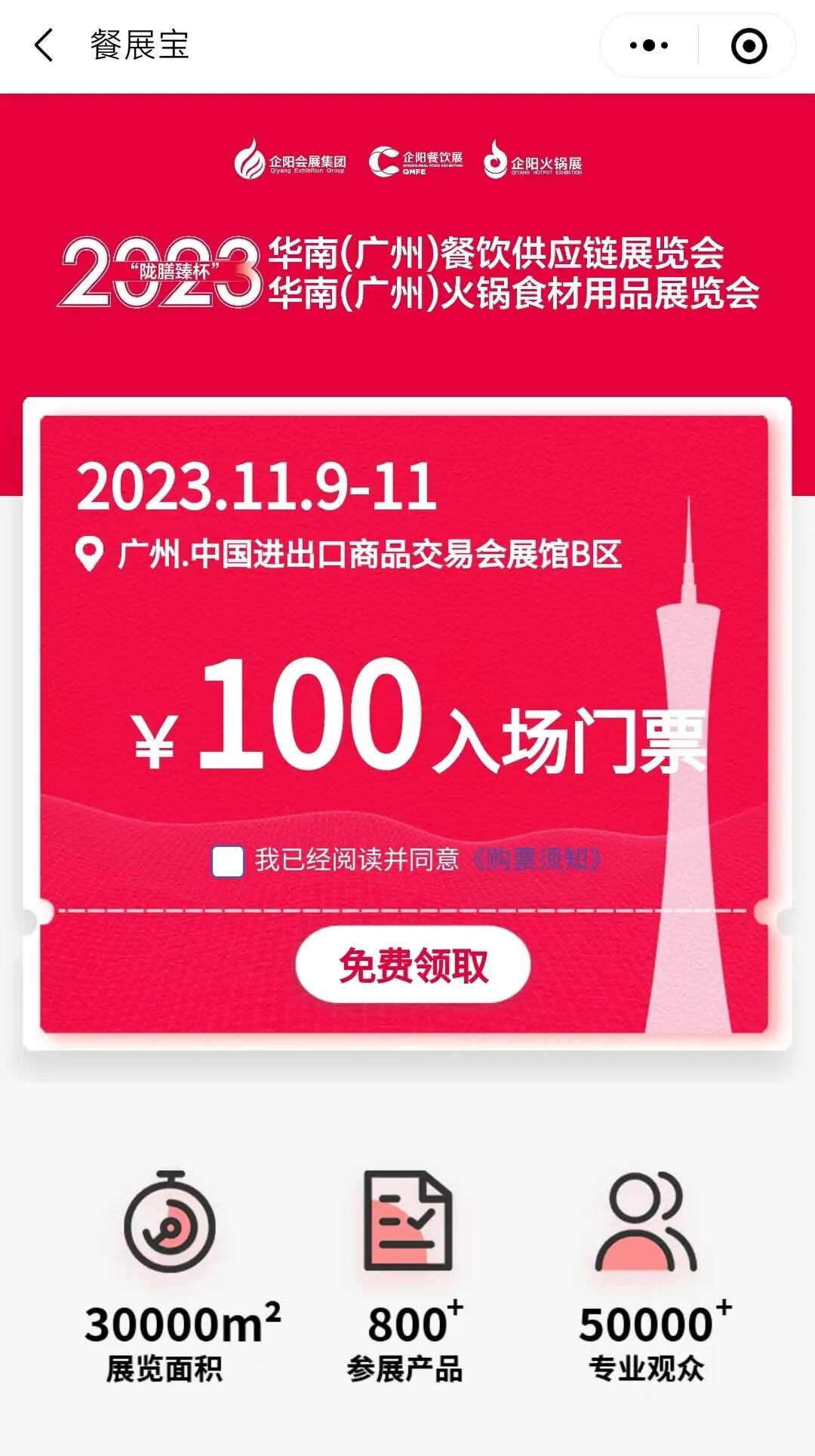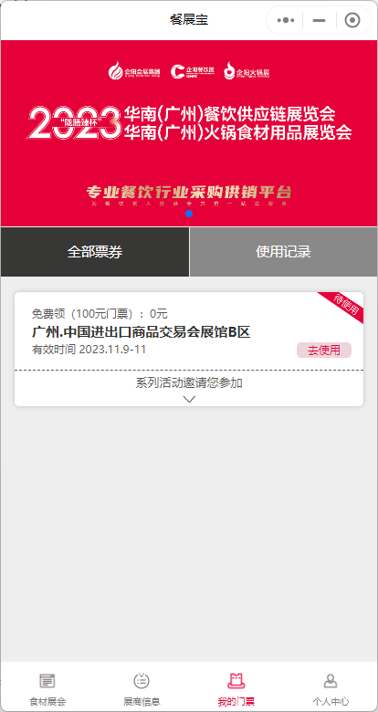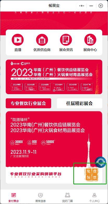 微信搜索小程序“餐展宝”,在“食材展会”页面“专业餐饮行业展会”,找到“2023华南(广州)展免费领票”点击授权进入。