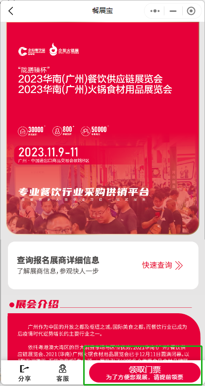 在展会介绍页面右下方点击“领取门票”。