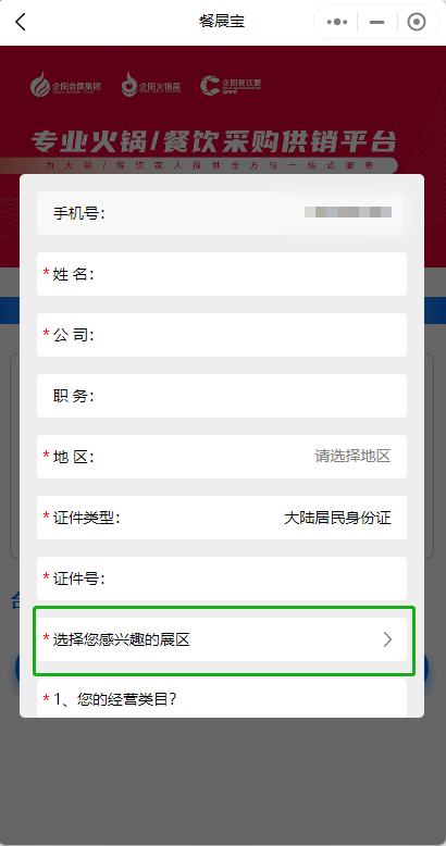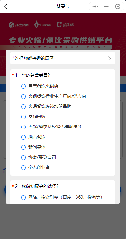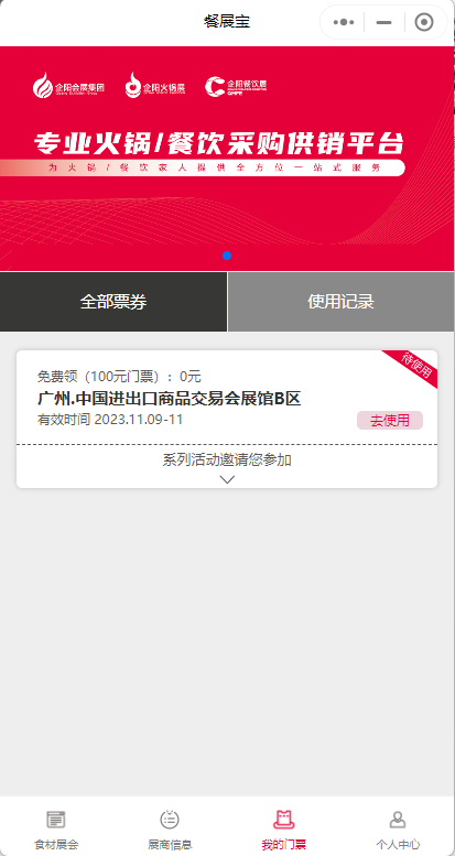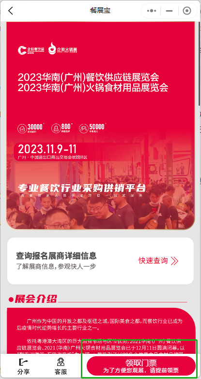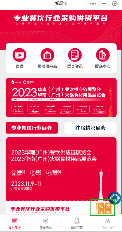 微信搜索小程序“餐展宝”,在“食材展会”页面“专业餐饮行业展会”,找到“2023华南(广州)展免费领票”点击授权进入。