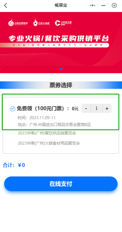 在“票券选择”勾选免费领100元门票0元购,点击在线支付。