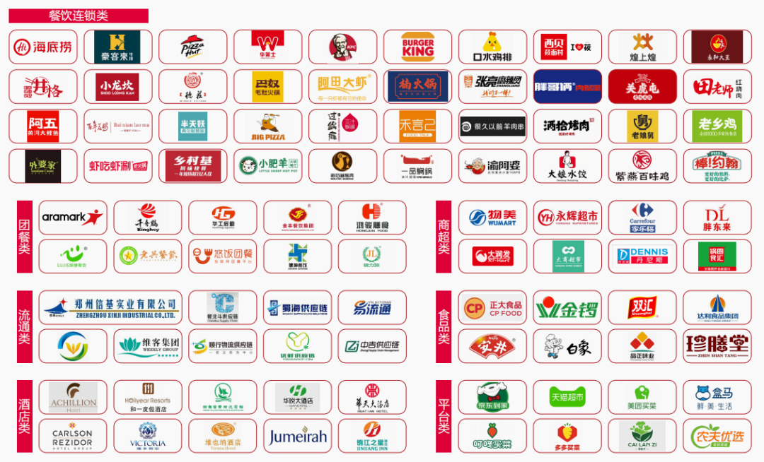 大型酒店、连锁商超、连锁餐企、中式酒楼、西餐厅、快餐、团餐、连锁火锅店、自助餐、学校、食堂、机关、行政单位食堂、旅游景点、度假村、娱乐场所、中央厨房、大型餐饮机构、餐饮服务企业等。