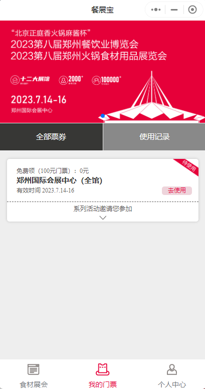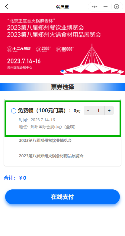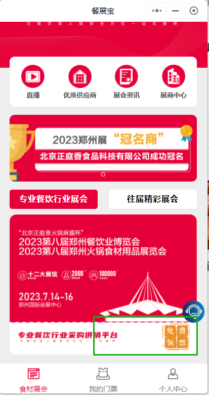 微信搜索小程序“餐展宝”,在“食材展会”页面“专业餐饮行业展会”,找到“2023第八届郑州展免费领票”点击授权进入领票。