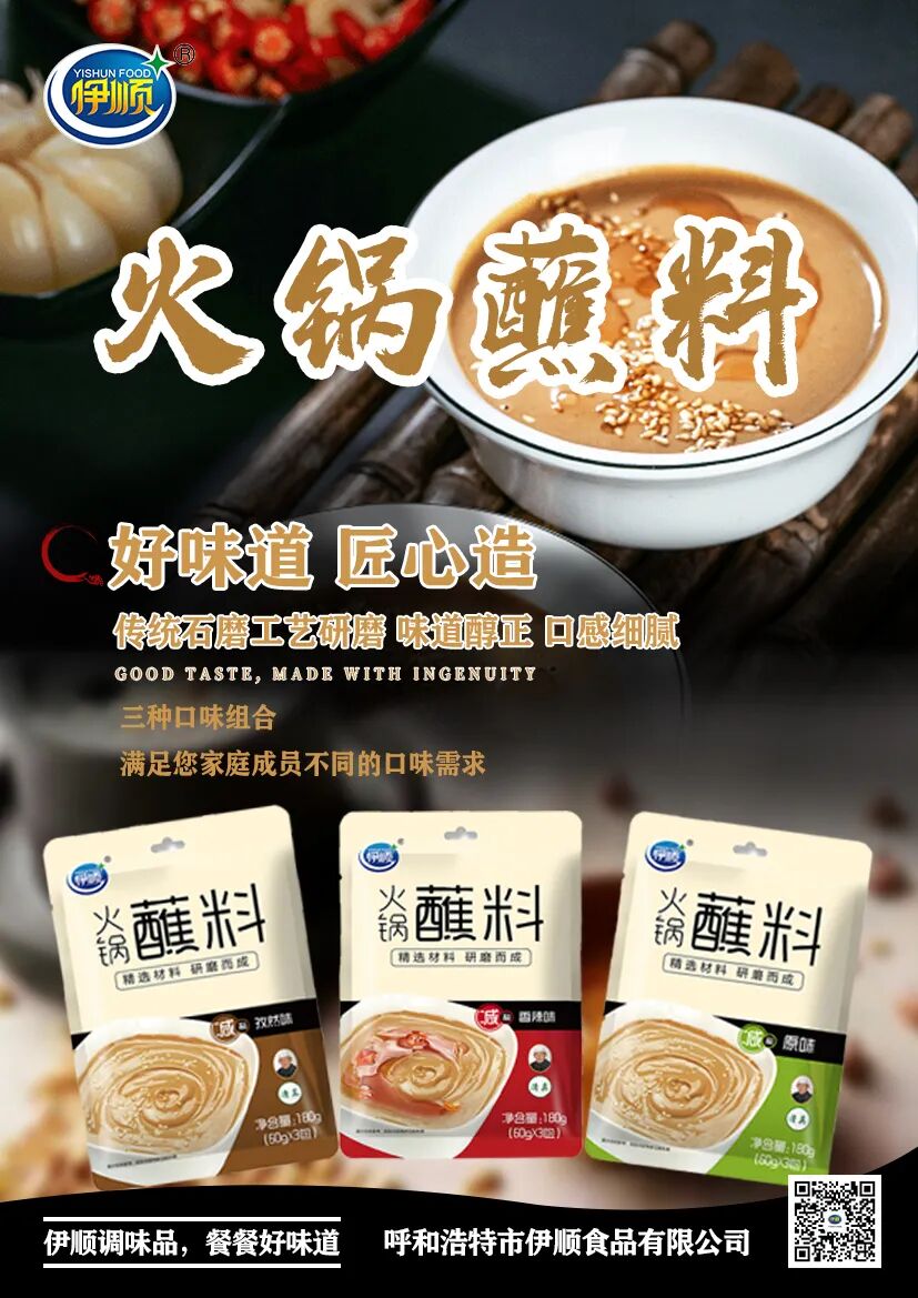 火锅蘸料:公司采用传统的石磨工艺,精心研磨。味道醇正,口感细腻,三种口味组合满足您家庭成员的不同口味需求,适用于蘸食涮肉、涮蔬菜,蘸食馒头面包,爆肚等其他食材,或拌面条等。其色香味浓,香而不腻,方便快捷。