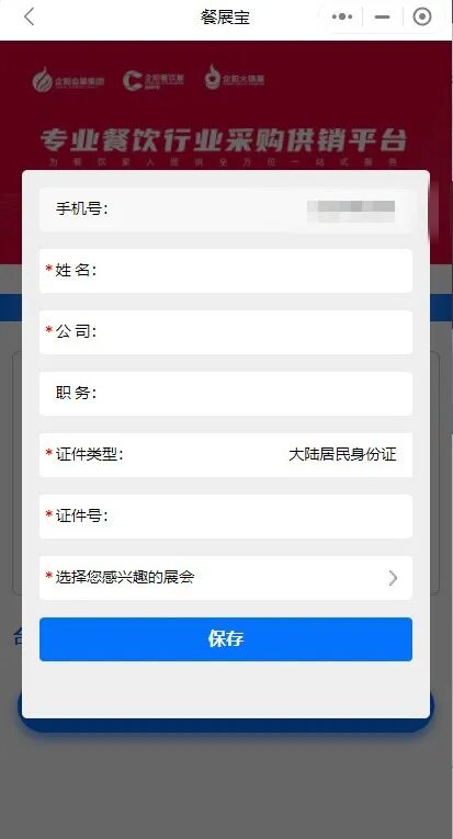 按步骤填写相关资料信息,在“选择感兴趣的展区”栏,滑动选择“火锅食材及调味品展区”或“餐饮食材展区”或“预制菜展区”或“餐厨及食品包装加工设备展区”或“餐饮美食加盟展区”,然后按需选择后保存即可。