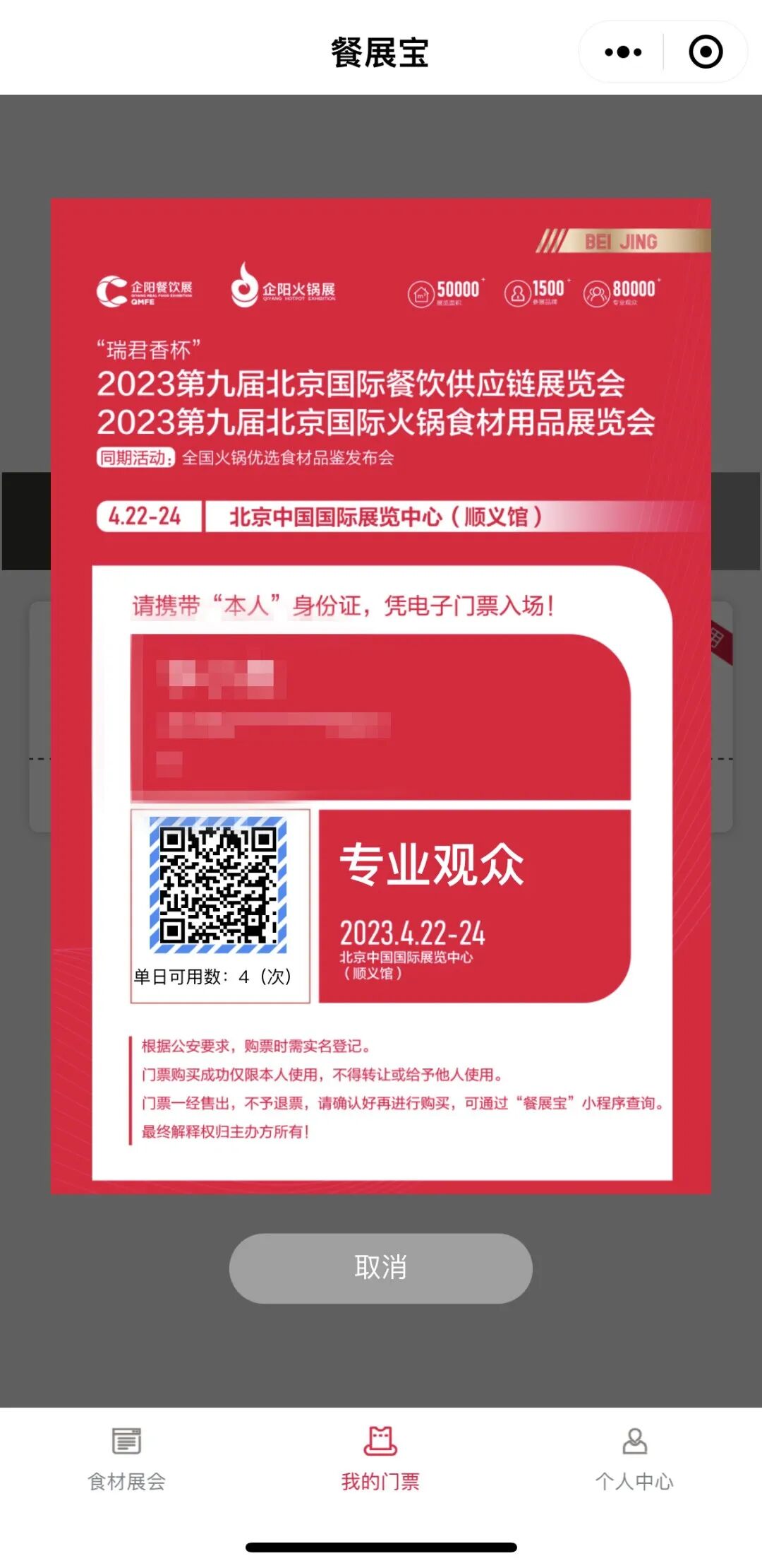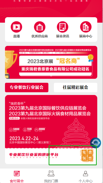 微信搜索小程序“餐展宝”,在“食材展览”页面“专业餐饮行业展会”,找到“2023第九届北京展免费领票”点击授权进入。
