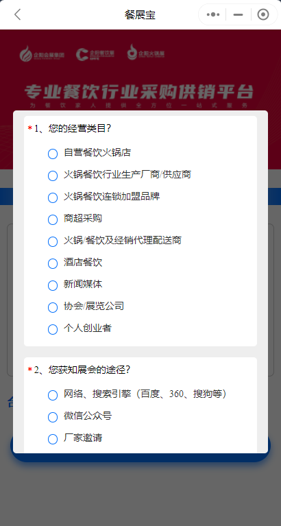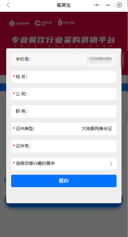 按步骤填写相关资料信息,在“选择感兴趣的展区”栏,滑动选择“火锅食材及调味品展区”或“餐饮食材展区”或“预制菜展区”或“餐厨及食品包装加工设备展区”或“餐饮美食加盟展区”,然后按需选择后保存即可。