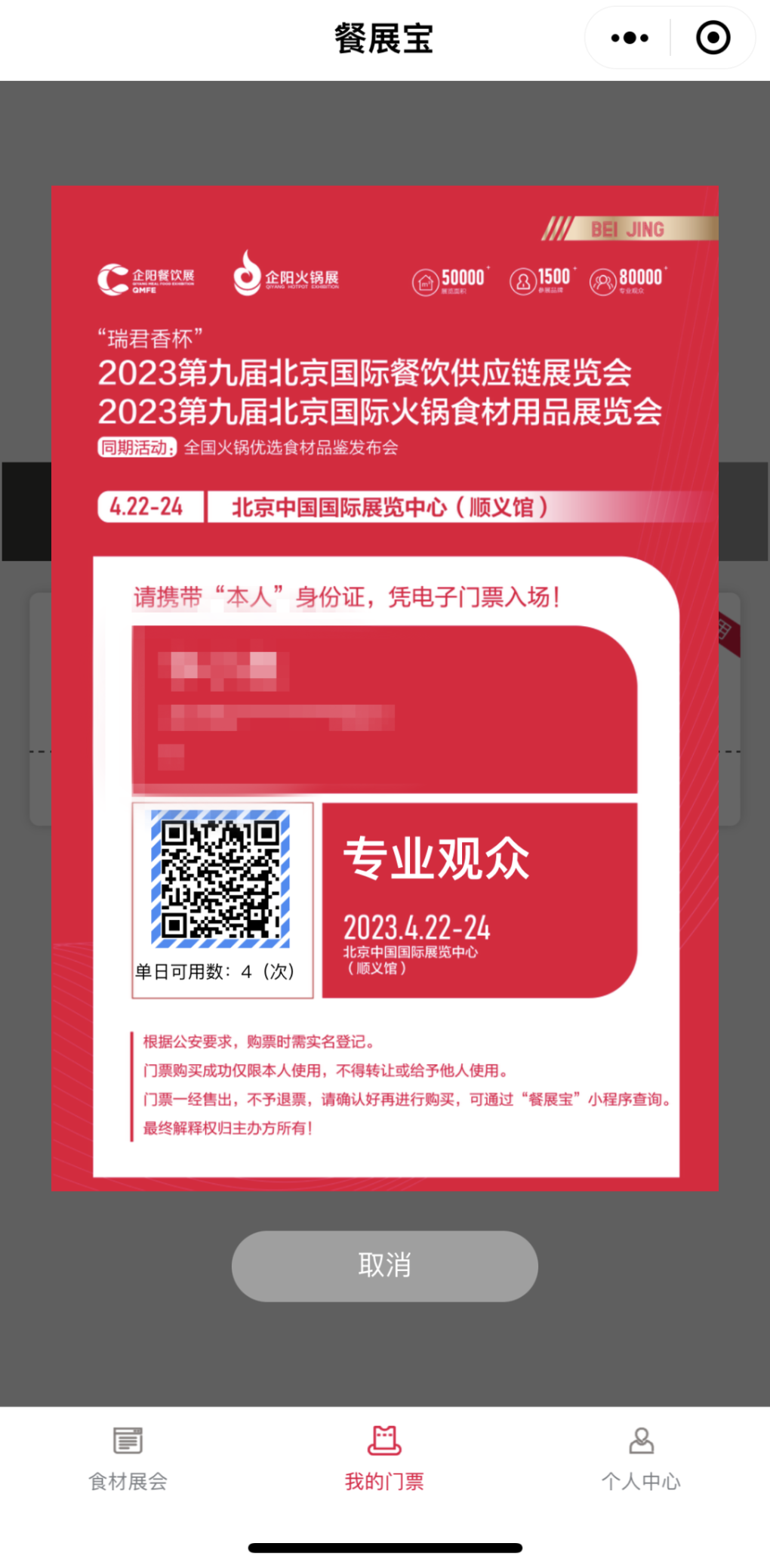 微信搜索小程序“餐展宝”,在“食材展览”页面“专业餐饮行业展会”,找到“2023第九届北京展免费领票”点击授权进入。