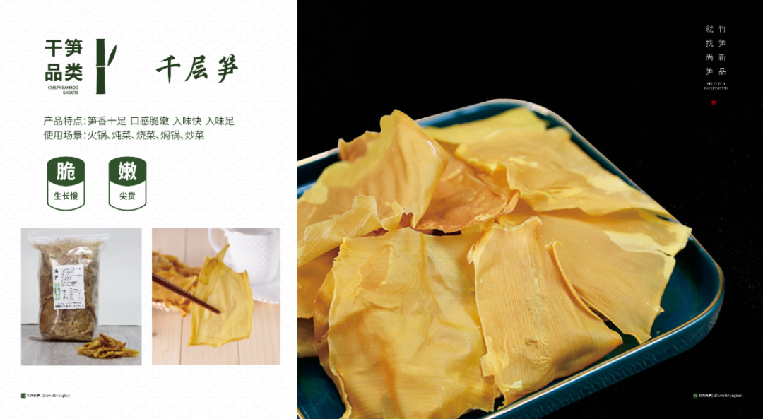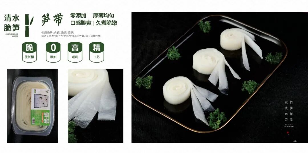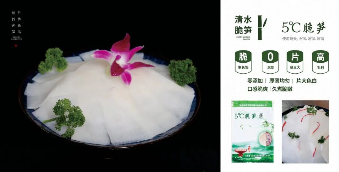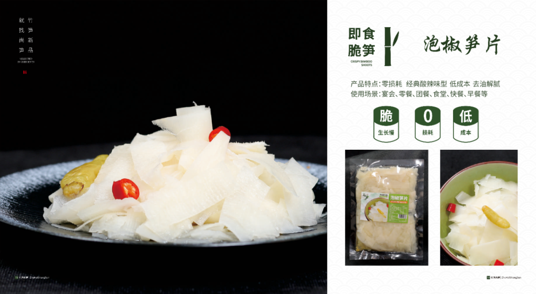 工厂位于四川宜宾,依托宜宾长宁竹海一一国家级竹海自然保护区的优质毛竹笋,以得天独厚“脆”“白”的原料笋,采用自主专利智能化设备,实现了精细化加工,开发出笋带、5C脆笋等一系列具有广泛市场前景的、且独一无二的常温脆笋产品,明显区别于市场现有的其它笋产品的外形和口感,给火锅、串串、中餐等餐饮企业提供了最新的食材。