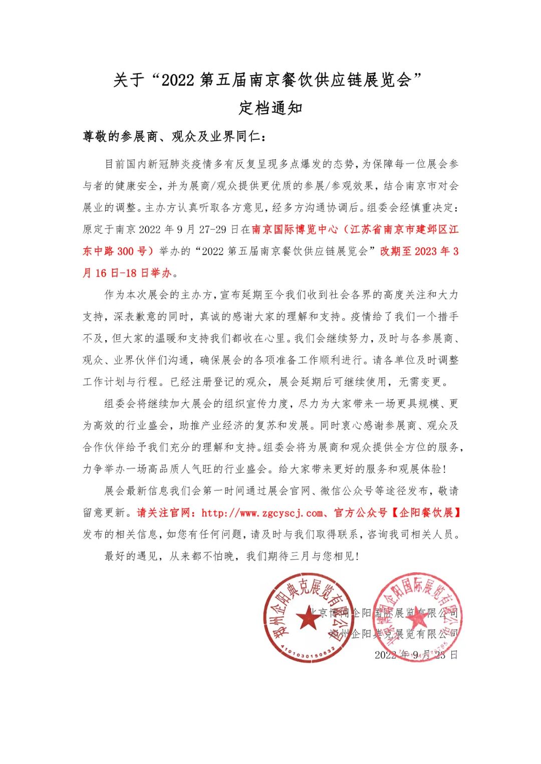 目前国内新冠肺炎疫情多有反复呈现多点爆发的态势,为保障每一位展会参与者的健康安全,并为展商/观众提供更优质的参展/参观效果,结合南京市对会展业的调整。主办方认真听取各方意见,经多方沟通协调后。组委会经慎重决定:原定于南京2022年9月27-29日在南京国际博览中心(江苏省南京市建邺区江东中路300号)举办的“2022第五届南京餐饮供应链展览会”改期至2023年3月16日-18日举办。