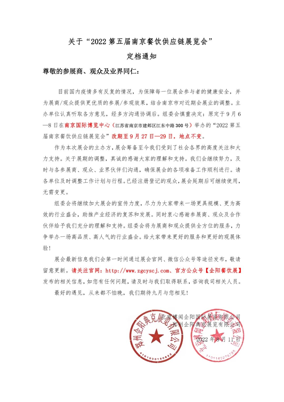目前国内疫情多有反复的情况,为保障每一位展会参与者的健康安全,并为展商/观众提供更优质的参展/参观效果,结合南京市对近期会展业的调整。主办单位认真听取各方意见,经多方沟通协调后。组委会慎重决定:原定于 9 月 6—8 日在南京国际博览中心(江苏省南京市建邺区江东中路 300 号)举办的“2022 第五届南京餐饮供应链展览会”改期至 9 月 27 日—29 日,地点不变。