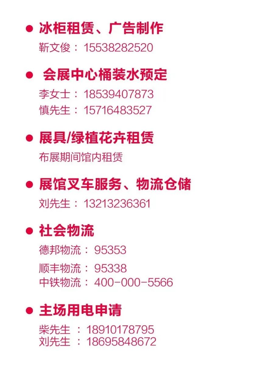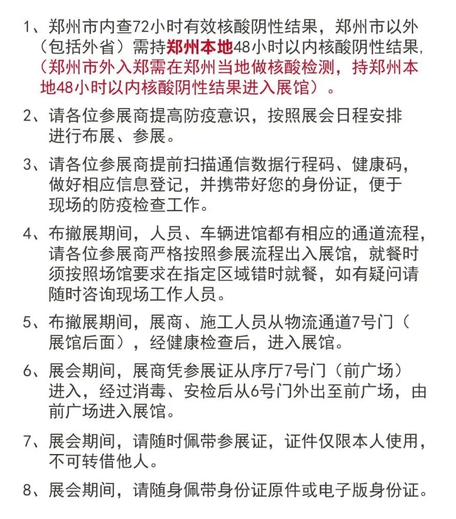 2、郑州火车站西广场乘坐地铁1号线,郑州火车站上车(河南大学新区方向) ,会展中心站(D口出)下车,步行600米左右到郑州国际会展中心。2、乘坐地铁5号线,郑州东站上车,中央商务区站(A2口出)下车,步行约910米到郑州国际会展中心。2、城郊线,新郑机场站上车(南四环方向),南四环站下车站内换乘地铁2号线(南四环-贾河) ,黄河路站下车,站内换乘地铁5号线,中央商务区站下车,步行约700米到郑州国际会展中心。2、入郑人员可提前下载“郑好办”,在核酸检测信息登记处报名登记个人信息获取个人二维码。3、请各位参展商提高防疫意识,按照展会日程安排进行布展、参展。4、请各位参展商携带好您的展商证、身份证。提前扫描通信数据行程码、健康码,做好相应信息登记。5、布撤展期间,人员、车辆进馆都有相应的通道流程,请各位参展商严格按照参展流程出入展馆。6、展会期间,请随身佩带参展证,证件仅限本人使用,不可转借他人。7、展会期间,禁止向洗手间和展馆内的垃圾桶倾倒汤料。如需倾倒汤料请到展馆物流通道卸货区的指定汤料回收处。温馨提示:为了您和他人的健康,请做好日常防护,正确佩带口罩,感谢各位火锅家人的配合,我们将竭力做好展会服务工作。