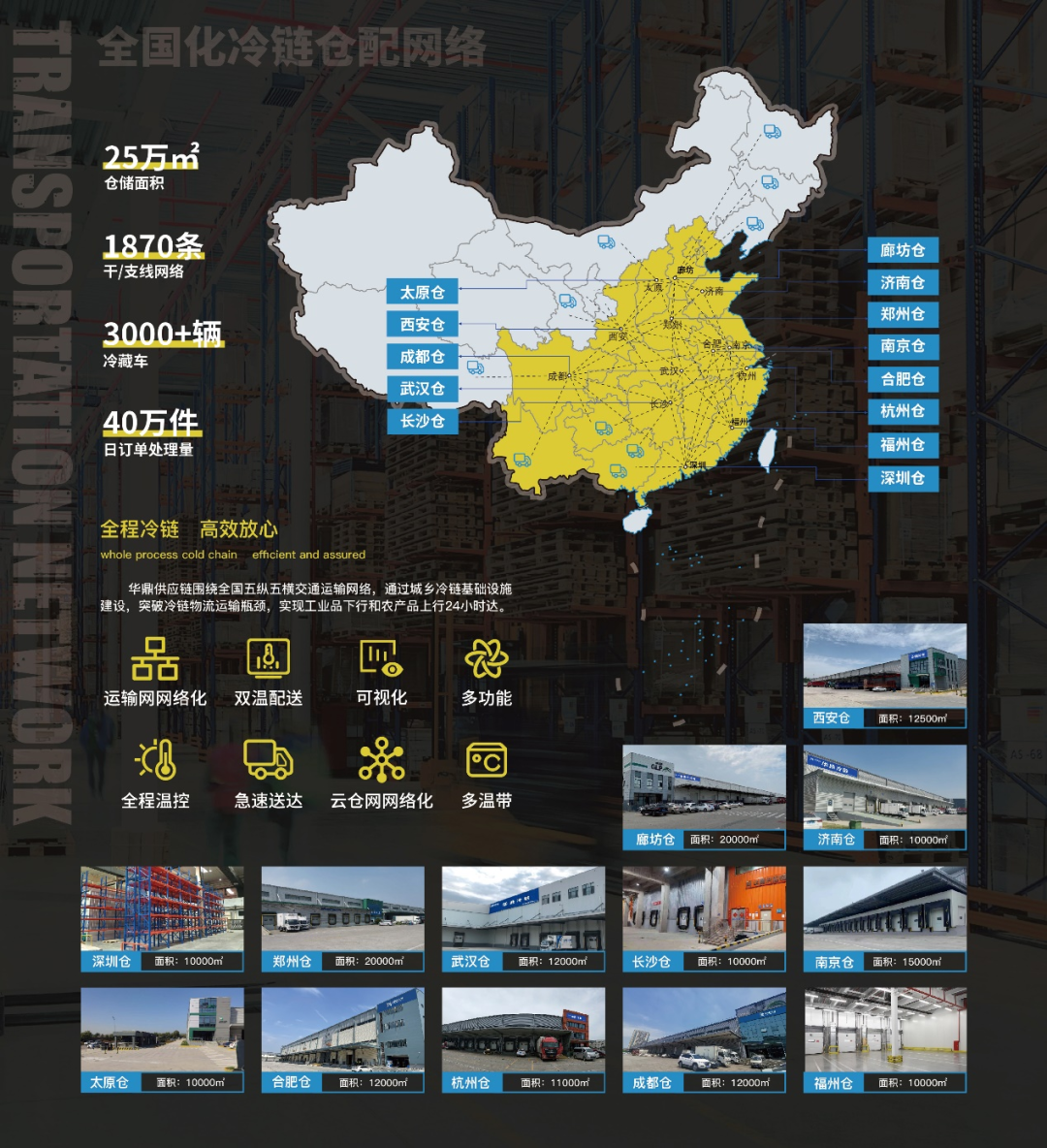 截至目前,华鼎供应链在全国已经有25个分支机构,12个省级中心仓,仓储面积25万平方,干支线网络1870条,辐射全国20多个省,243个地级市,1749个县,通过华鼎自主研发的SAAS系统,已连接上游工厂500余家,上游终端门店80000余家,并先后荣获“中国冷链百强企业”、“高新技术企业”、“专精特新企业”、“全国冷链运营创新企业”、“四星级冷链物流企业”、“河南省冷冻食材数字化供应链示范平台”等国家和行业荣誉,并参与国家城乡高效配送服务标准的制定。