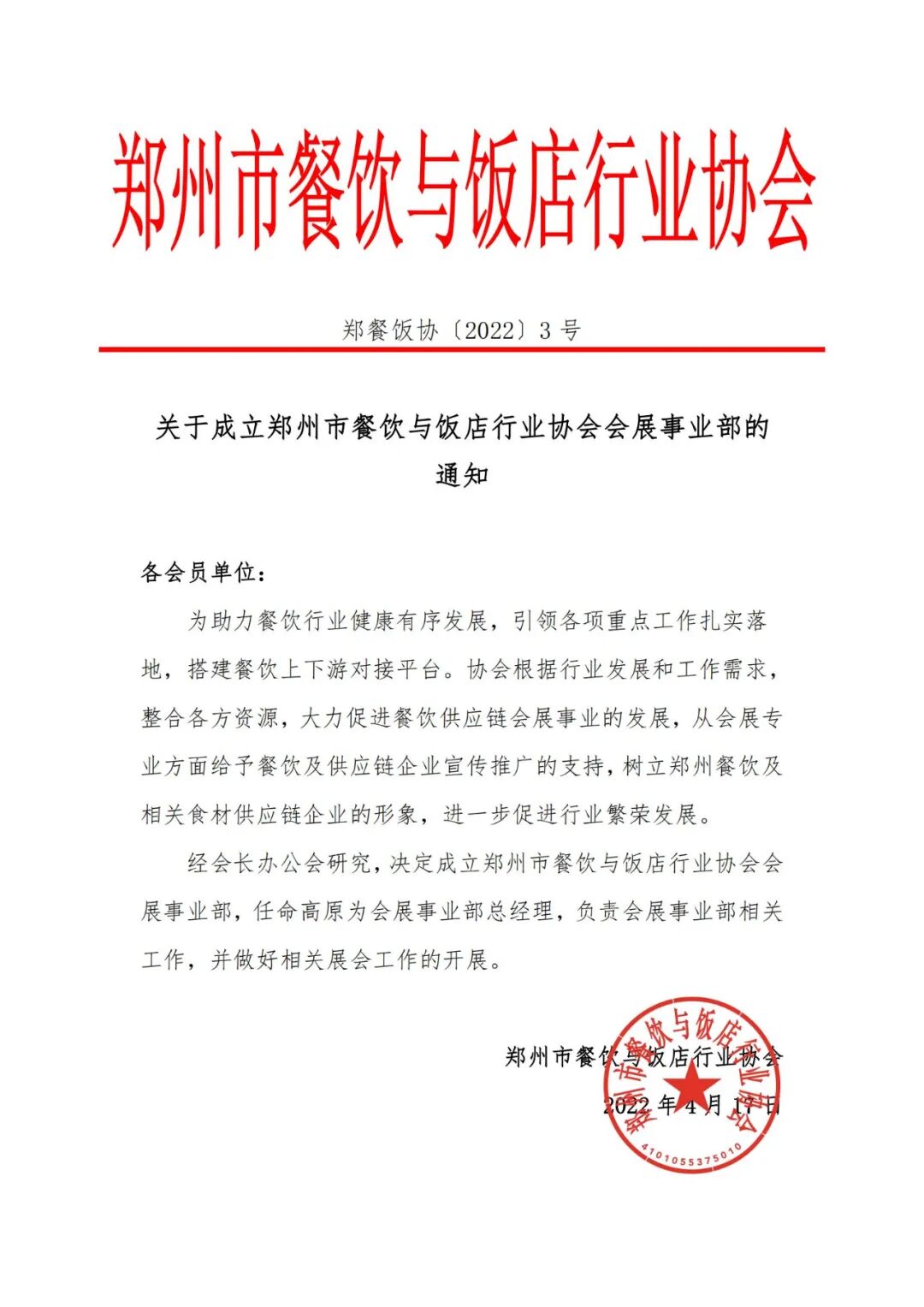 2022年4月17日,郑州市餐饮与饭店行业协会2022年会长办公会召开,会上研究表决通过了成立协会“会展事业部”的议案,任命企阳会展集团董事长、郑州企阳典克展览有限公司总经理高原为郑州餐协会展事业部总经理。