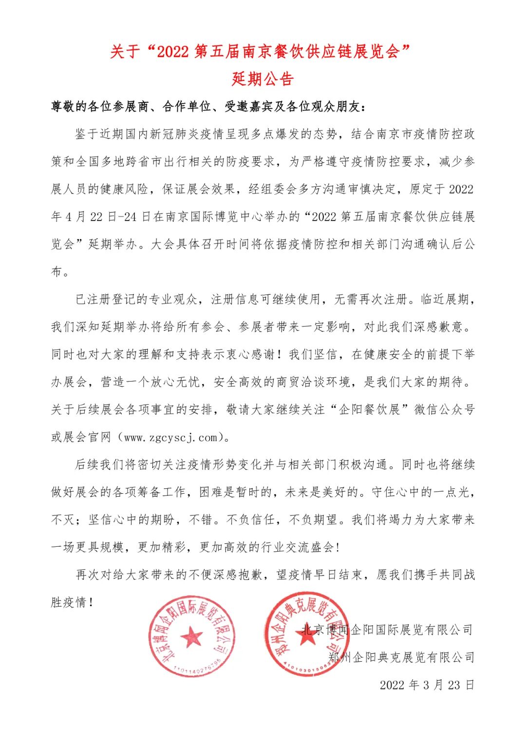 关于“2022第五届南京餐饮供应链展览会”延期公告